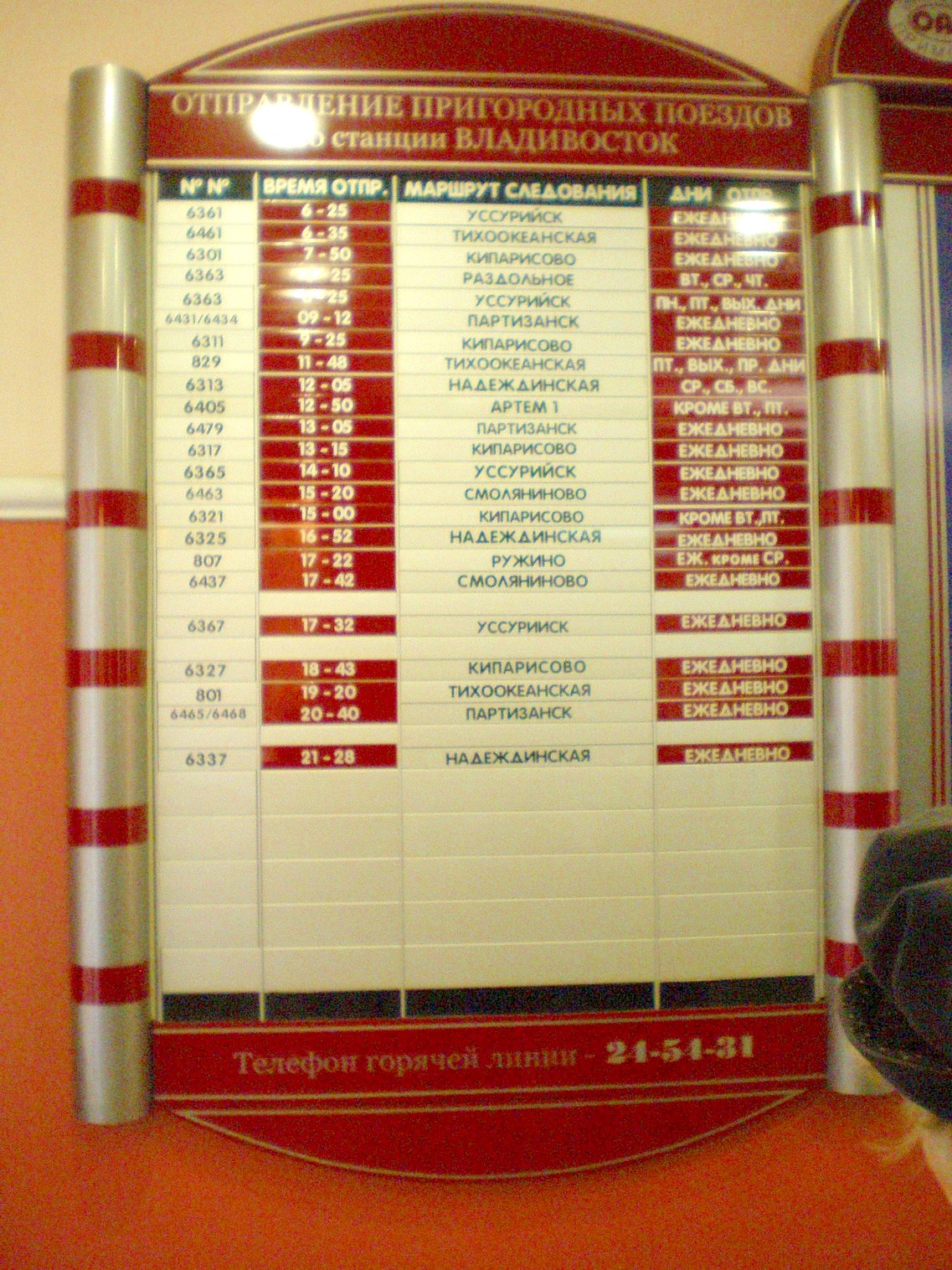 Расписание движения пригородных поездов, вывешенное на вокзале станции Владивосток.