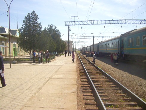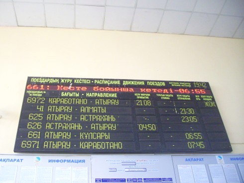 Через два часа после прибытия автобуса отправлялся скорый поезд «Акжайык» сообщением Гурьев — Алма-Ата-II. Но, как очень часто бывает в Казахстане, на него не было билетов. В кассе выясняю стоимость проезда в плацкартном вагоне до Алма-Аты — 2500 тенге. Уже у входа на вокзал пассажирам навязывали свои услуги проводники этого поезда, предлагавшие содействие в проезде.