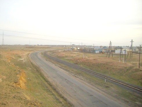 Вдали — город Байконур. Вид из окна вагона поезда «Акжайык» сообщением Гурьев — Алма-Ата.
