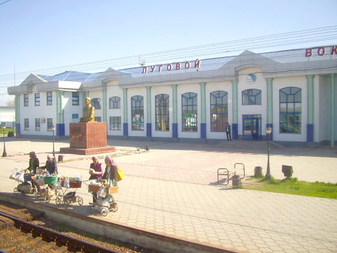 Вокзал на узловой станции Луговая. Вид из поезда «Акжайык» сообщением Гурьев — Алма-Ата.