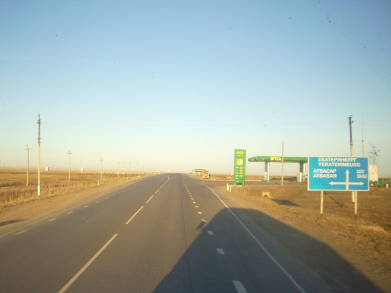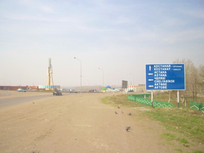 Выхожу из машины у въезда в Кустанай. Перед Кустанаем водитель пытался найти по рации какого-нибудь другого «дальнобойщика», который согласился бы довезти меня от Кустаная до границы (это почти 200 километров). Но все водители, с которыми удалось наладить связь, ехали в сторону Актюбинска.