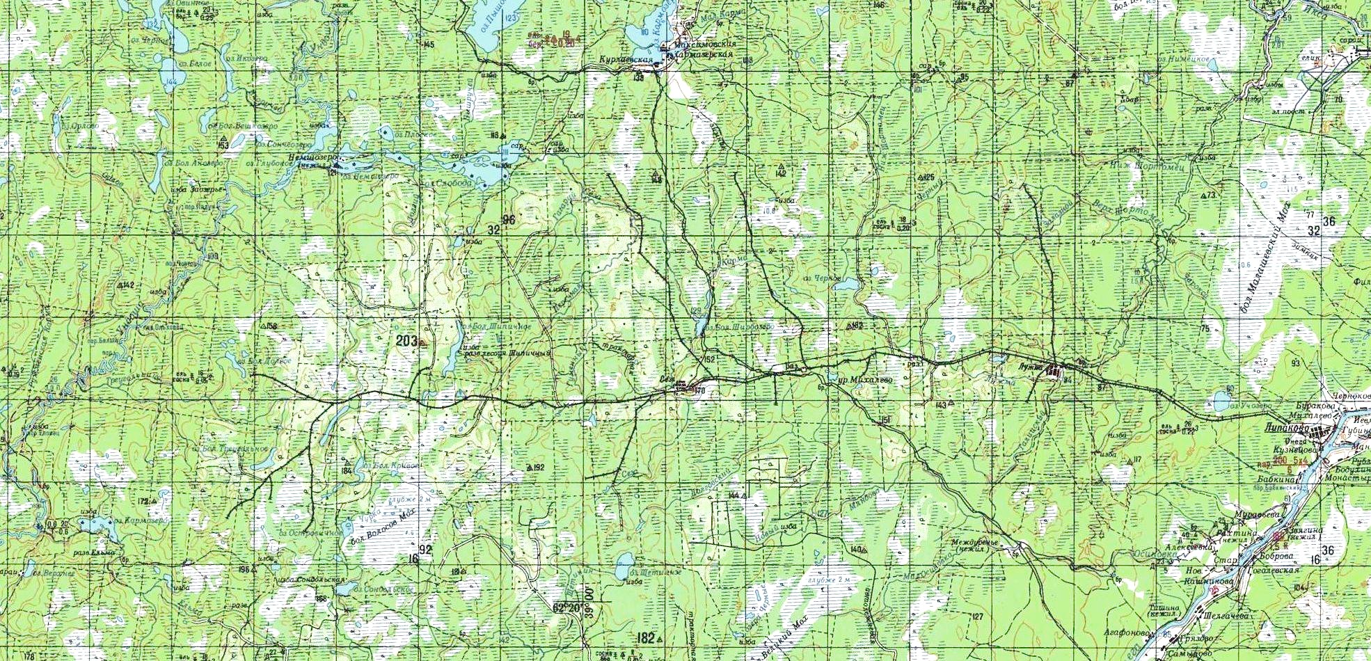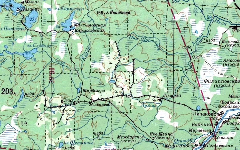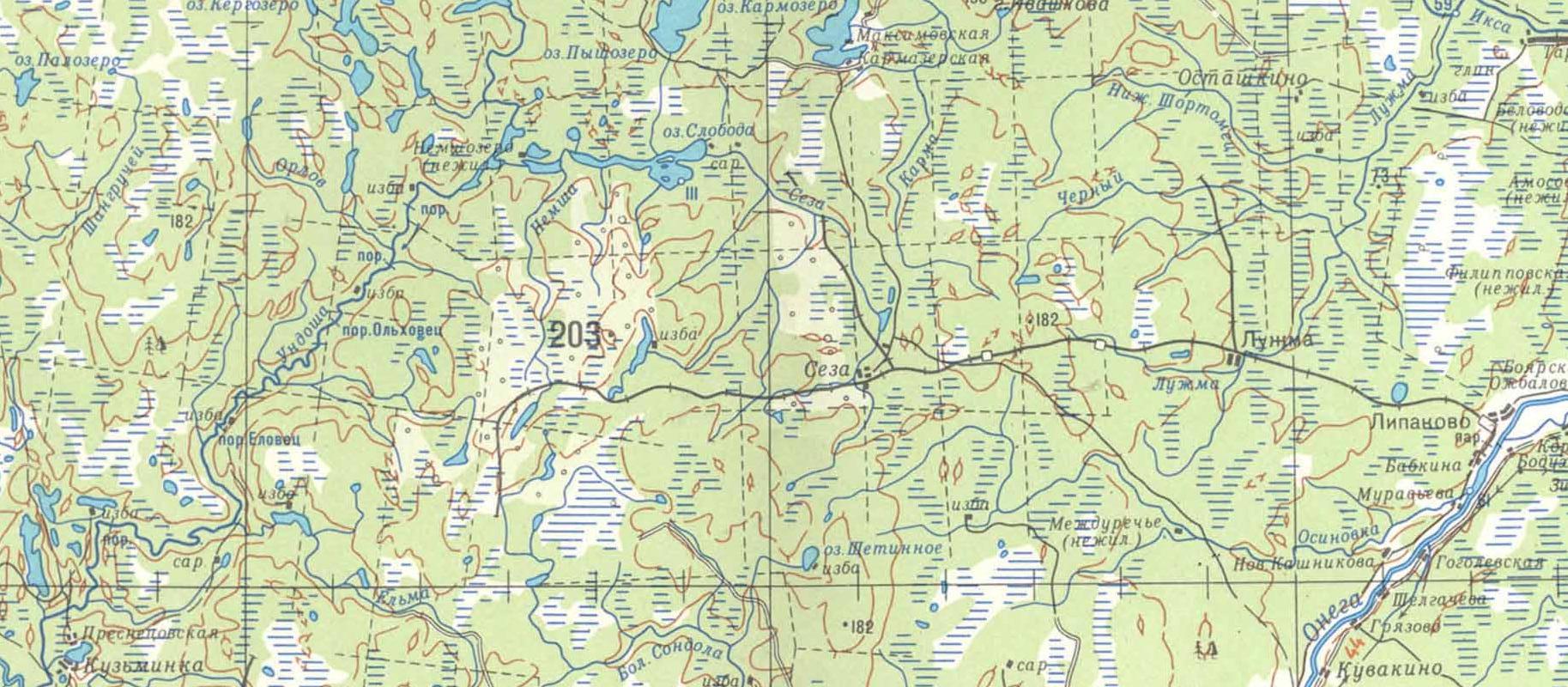 Узкоколейная железная дорога на топографической карте масштаба 1:500 000 (cостояние местности на 1960-е годы).