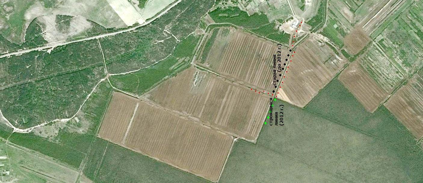 Узкоколейная железная дорога на спутниковом снимке (источник — «Google Maps», дата съёмки — 2009 год).