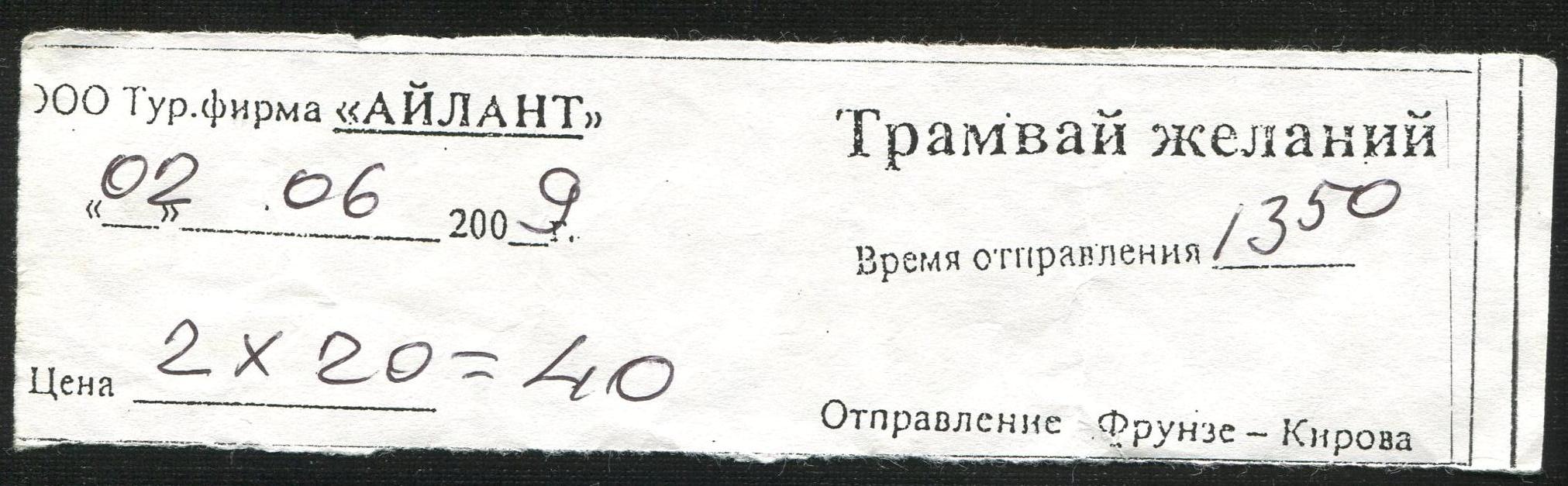 Билет для проезда в экскурсионном «Трамвае «Желаний». 2009 год.