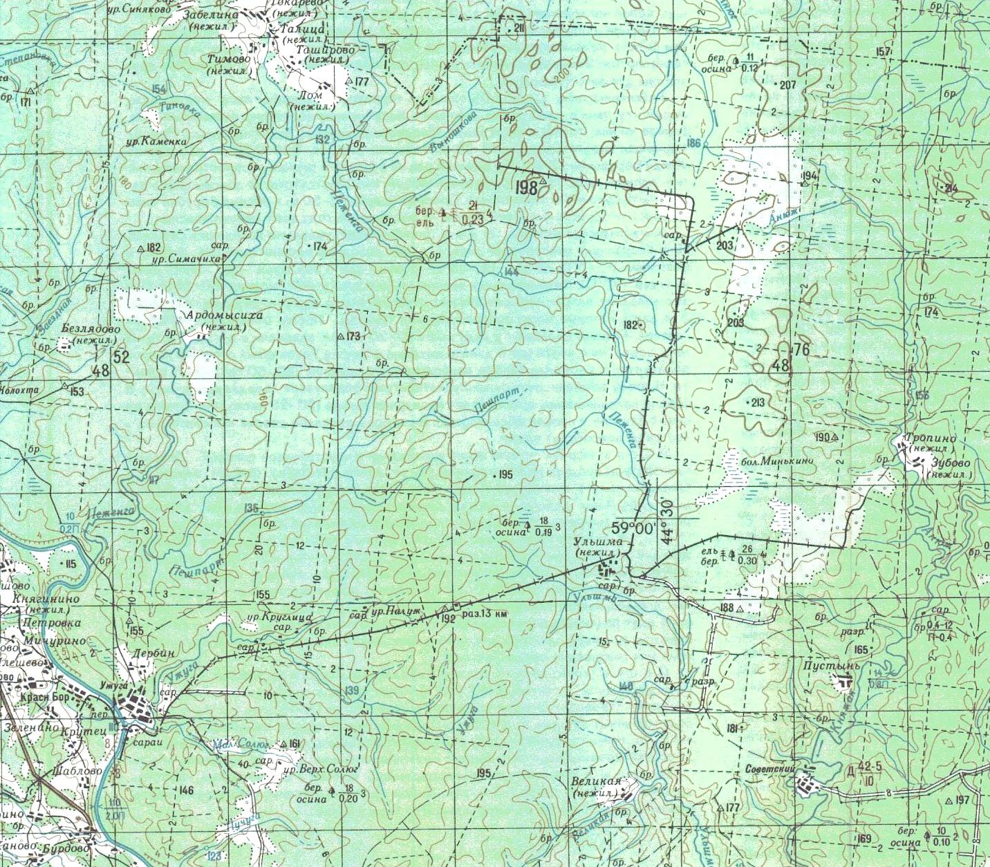 Узкоколейная железная дорога на топографической карте масштаба 1:200 000, изданной в 1989 году.