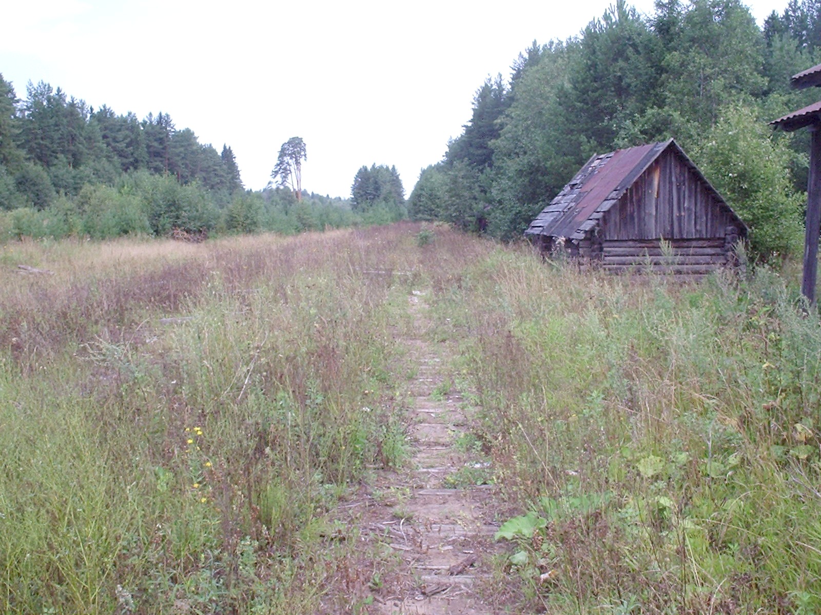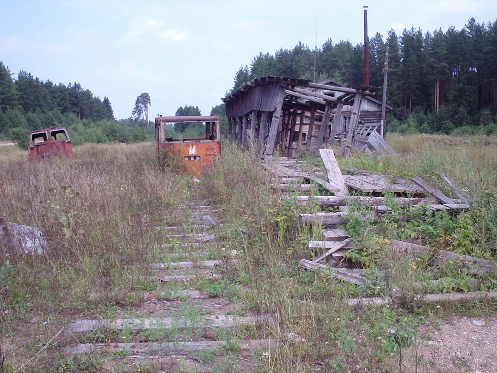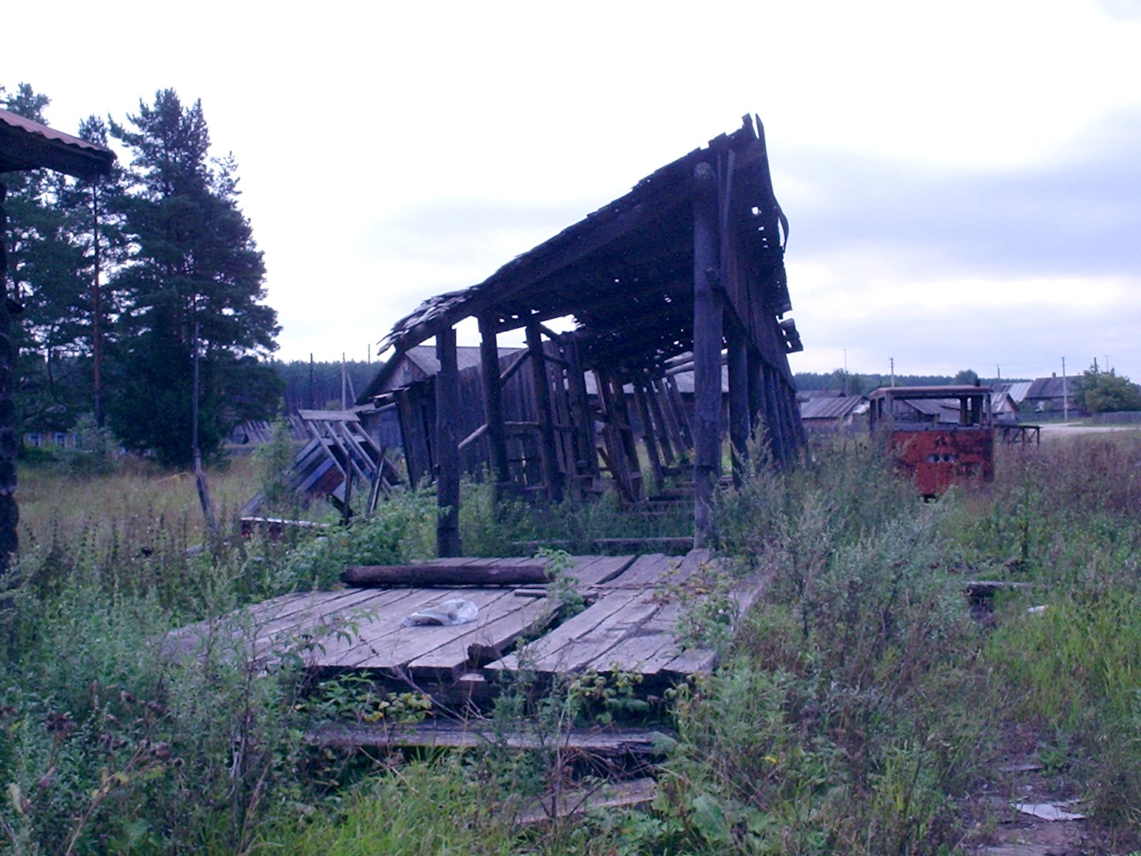 Полуразрушенная пассажирская посадочная платформа в посёлке Якша. Рядом с ней
