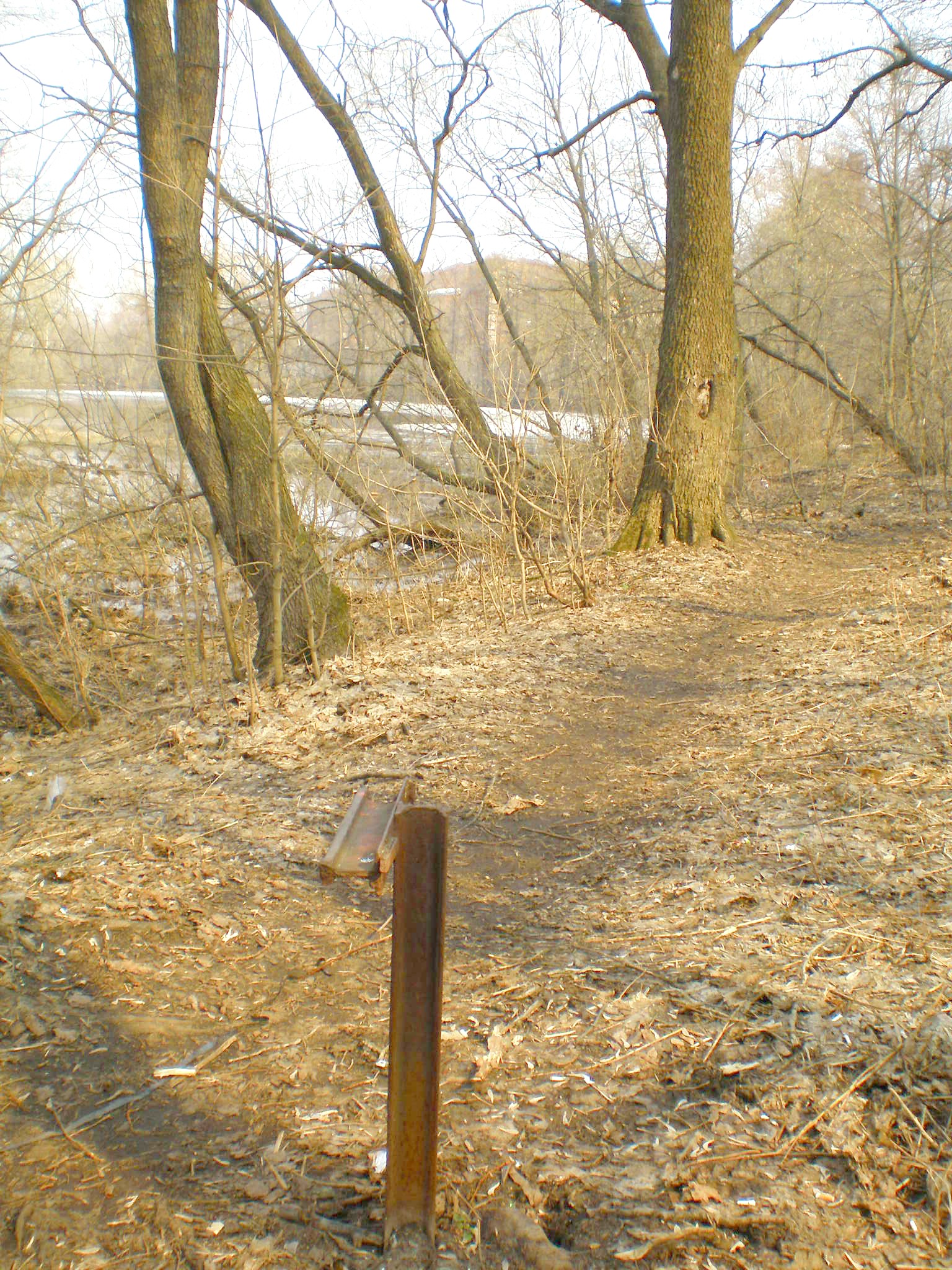 Рельсы узкой колеи, вкопанные в землю рядом с Дрезненской прядильно-ткацкой фабрикой.