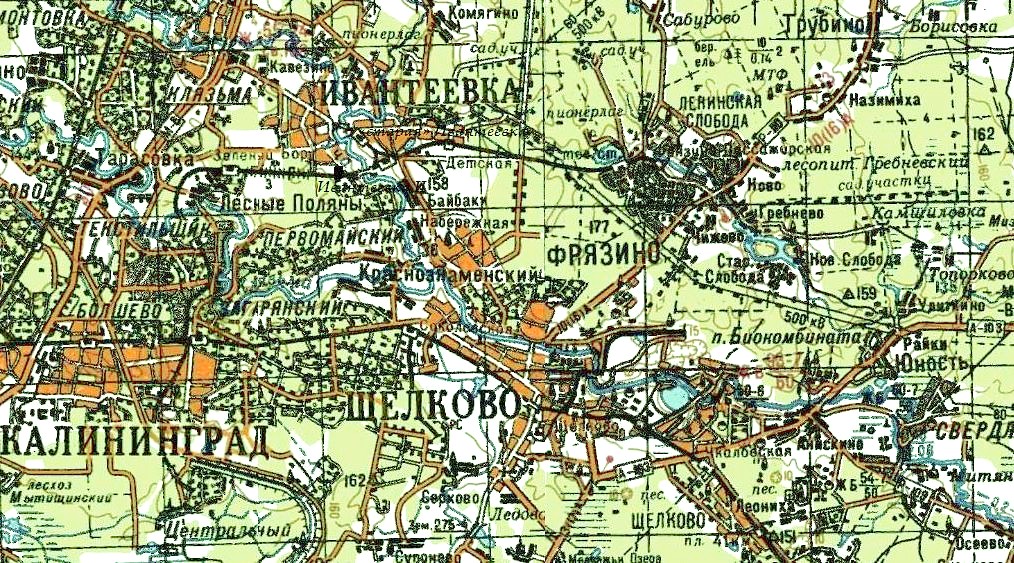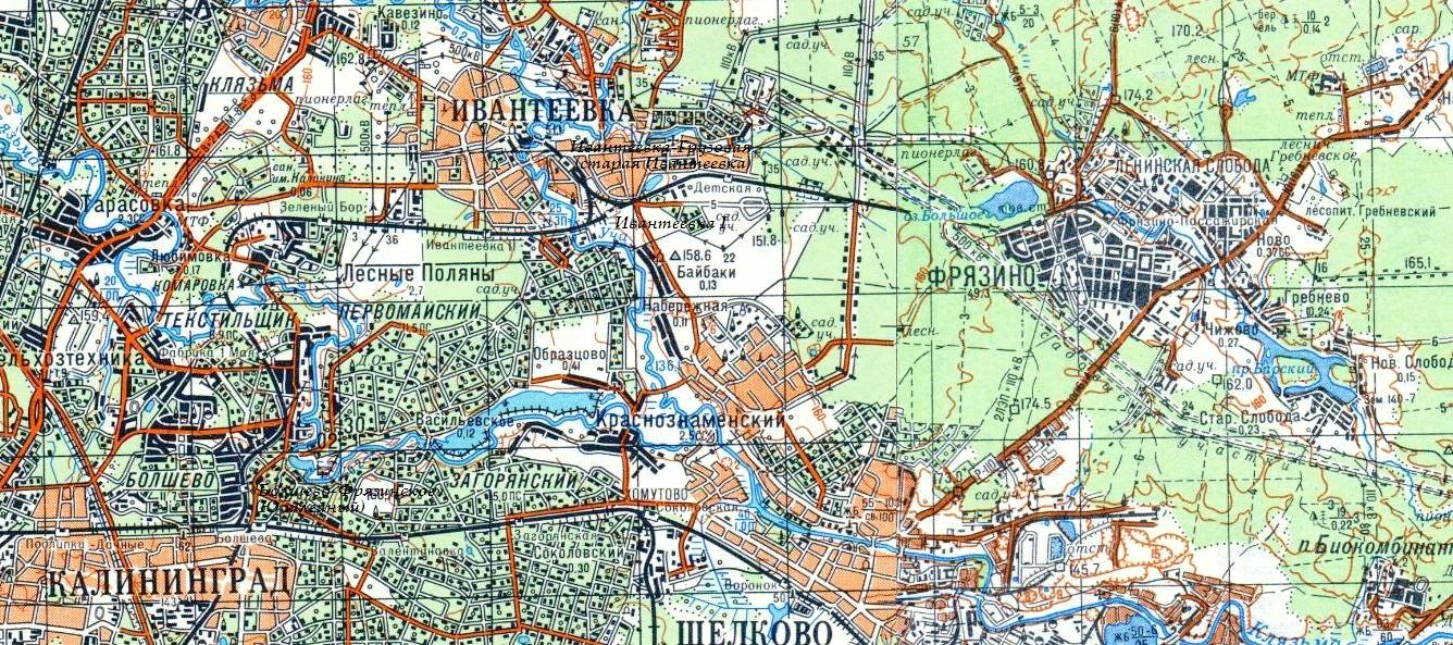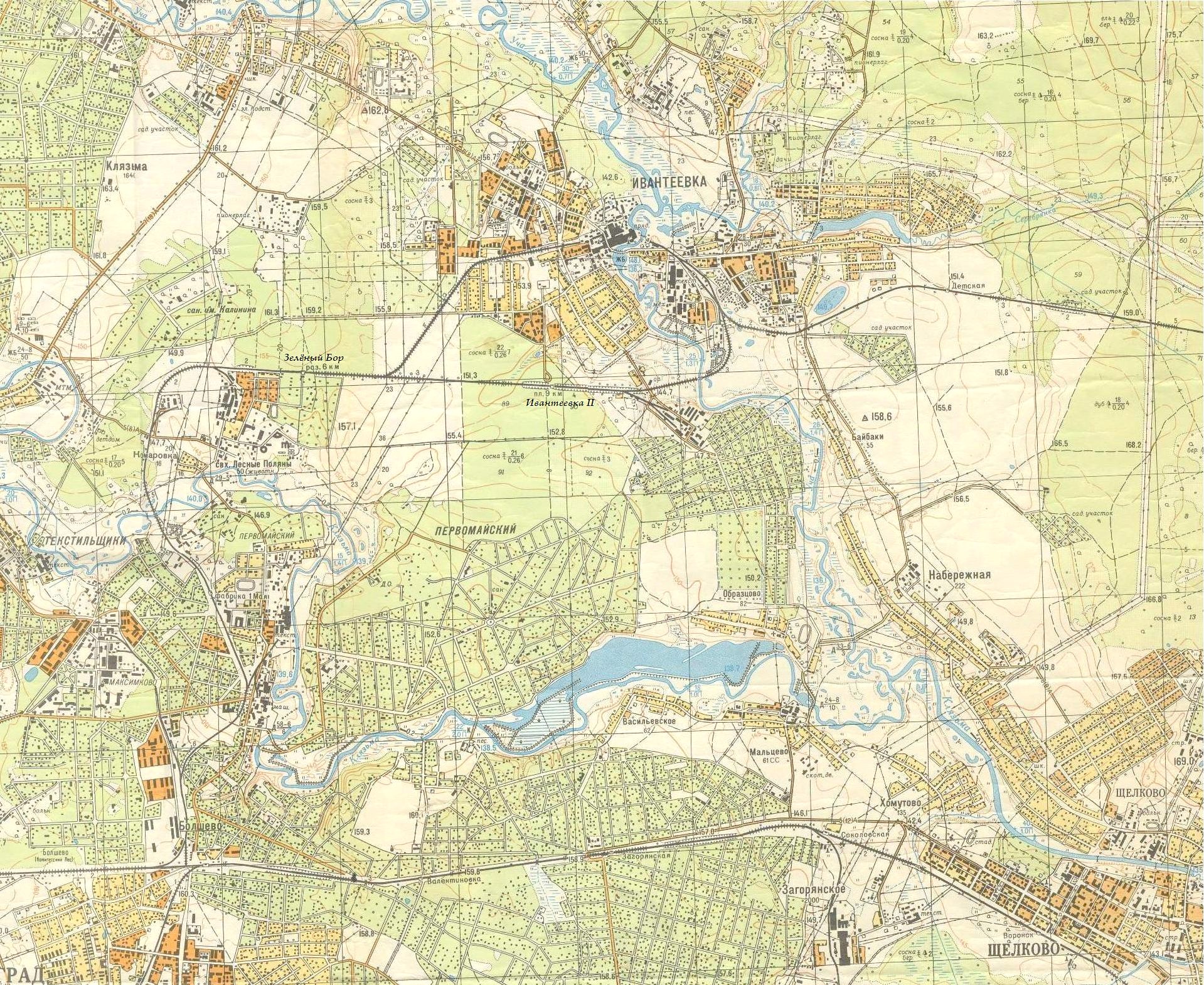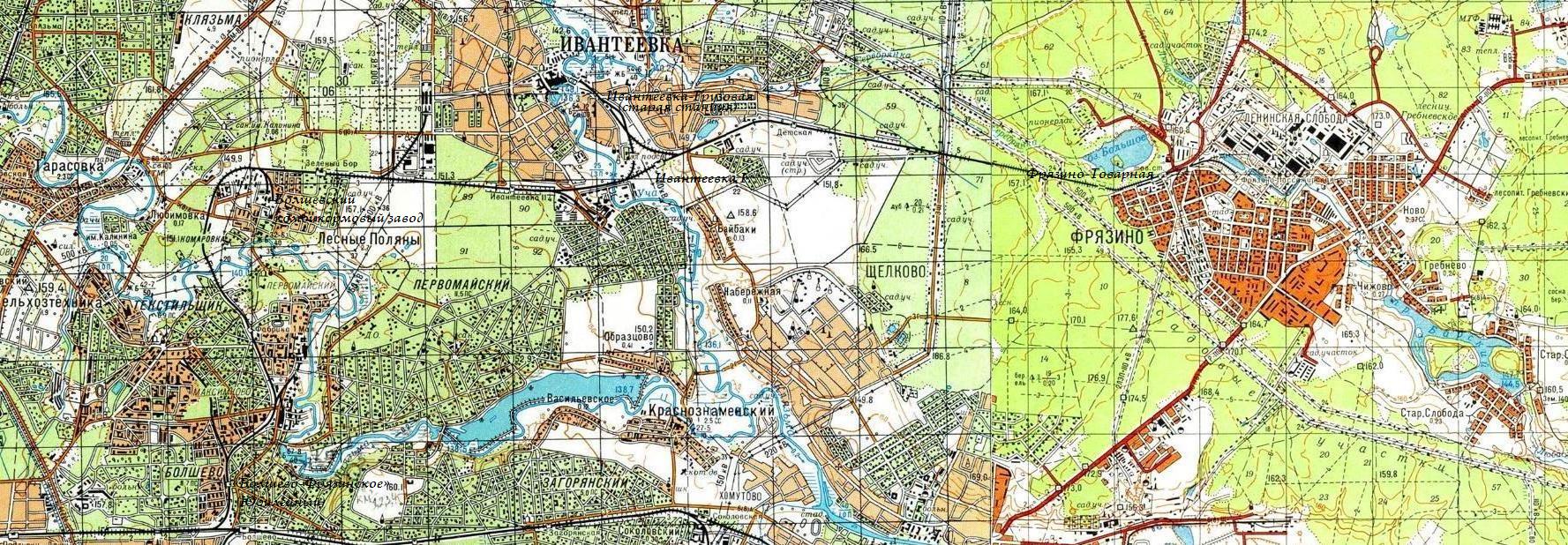 Железнодорожная линия на топографической карте масштаба 1:25 000 (в 1 сантиметре — 250 метров), изданной в 1968 году. Линия в Ивантеевке показана в том виде, в каком она была до 1967 года.