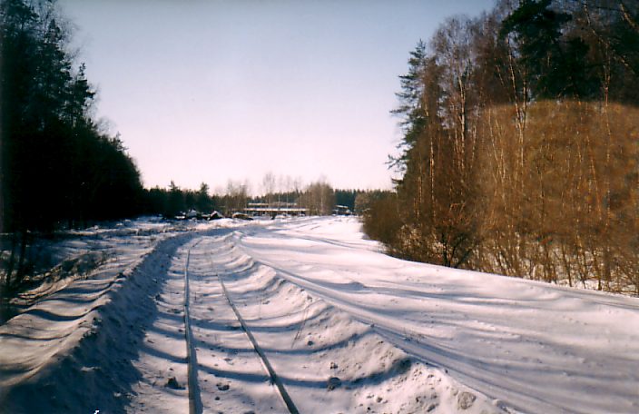 Последняя стрелка на главной станции узкоколейной железной дороги (вблизи территории торфобрикетного завода).