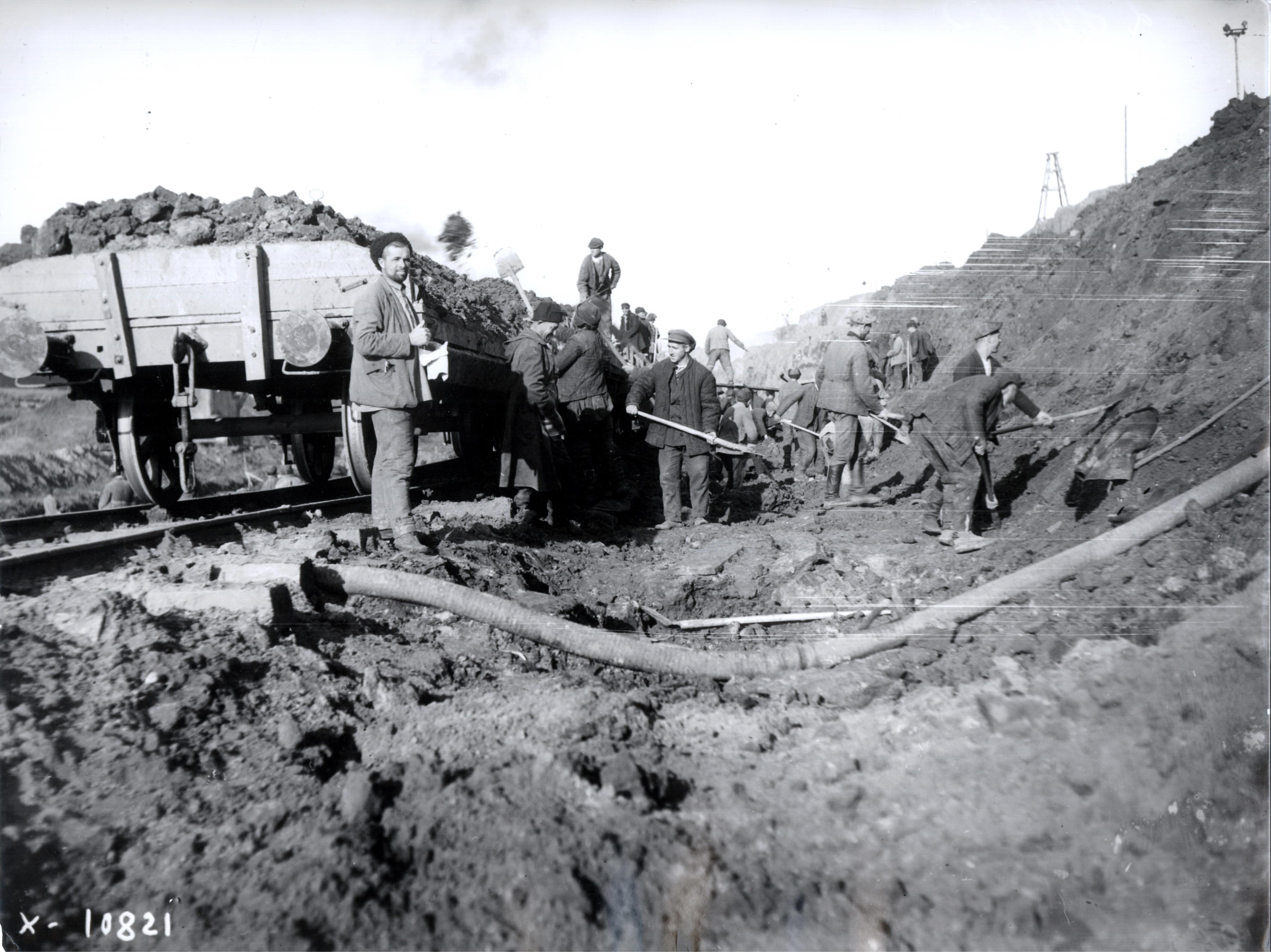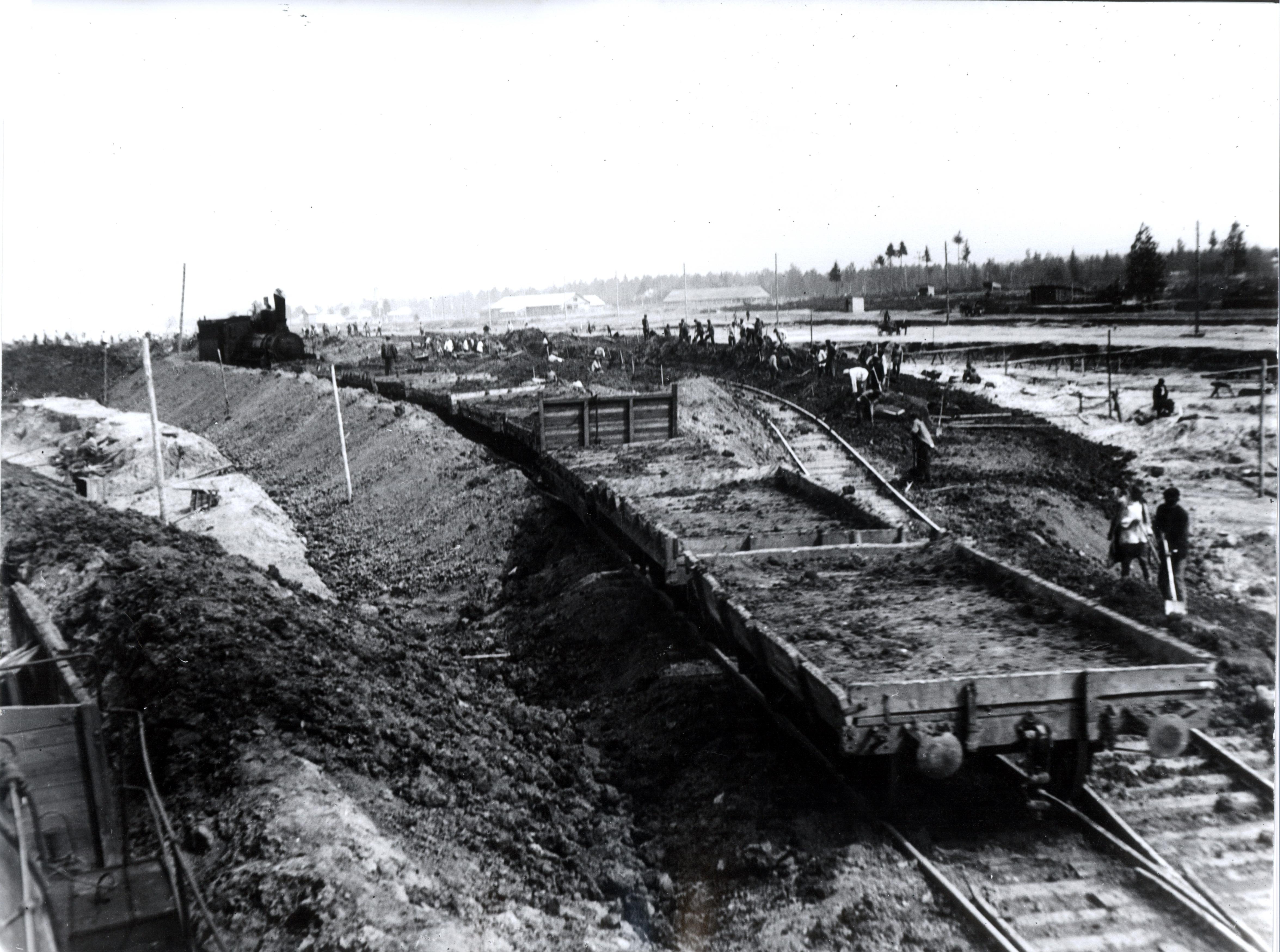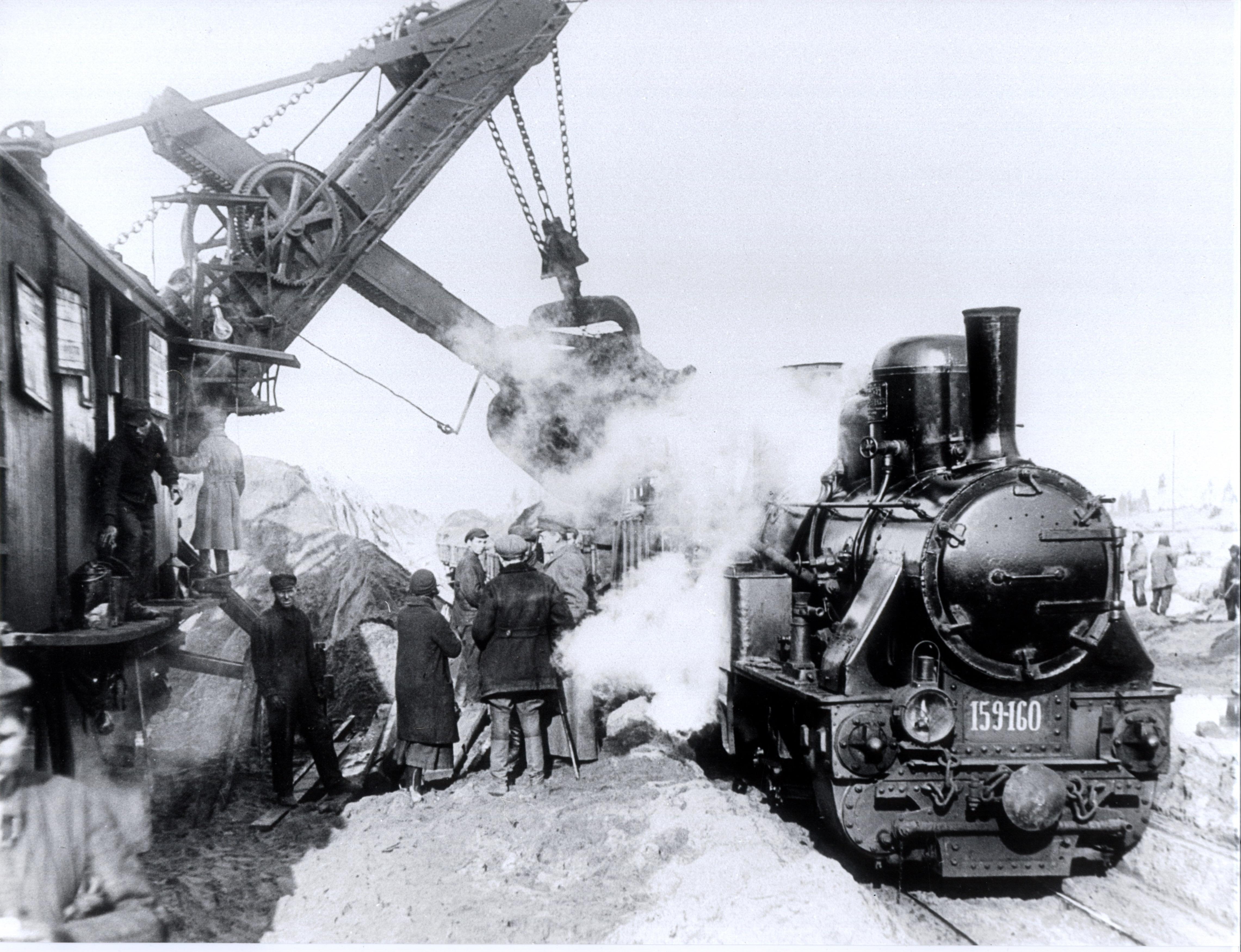 Погрузка грунта в вагоны узкоколейной железной дороги. Паровоз 159-160.