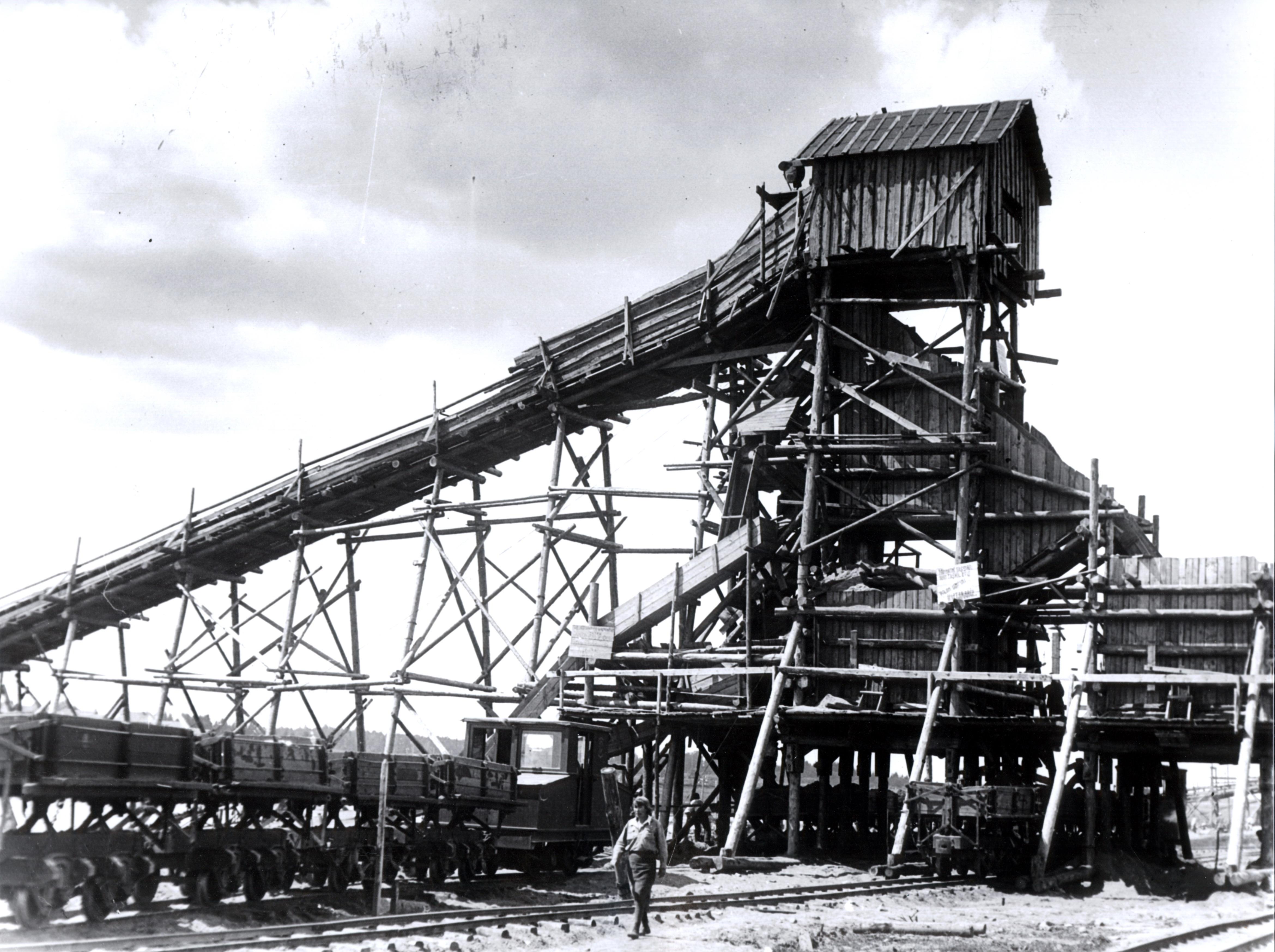 Эстакада для погрузки грунта, предположительно вблизи Иваньковской плотины. Узкоколейный мотовоз, узкоколейные вагонетки.