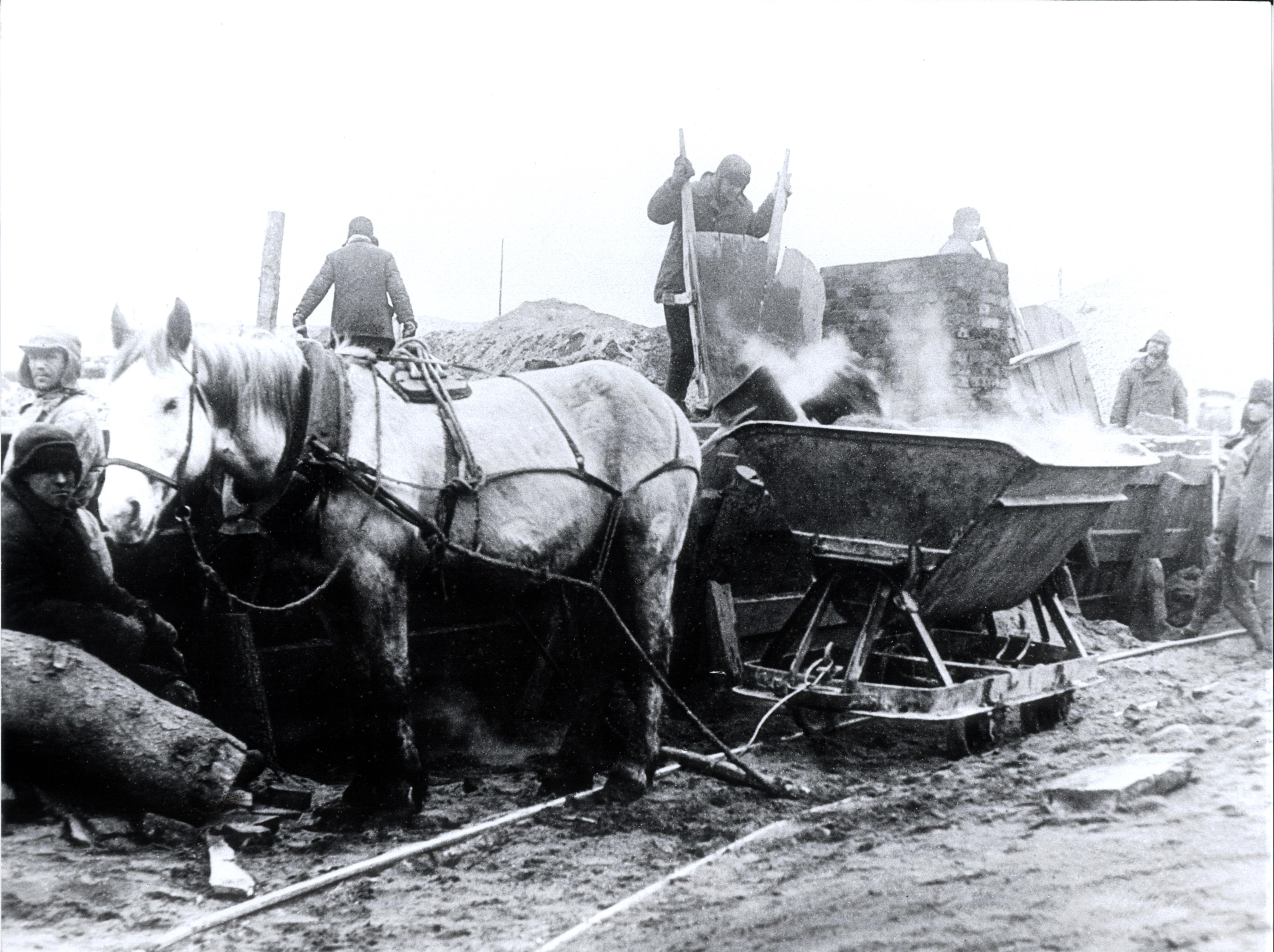 Конная тяга. Погрузка грунта в коечную вагонетку узкой колеи.