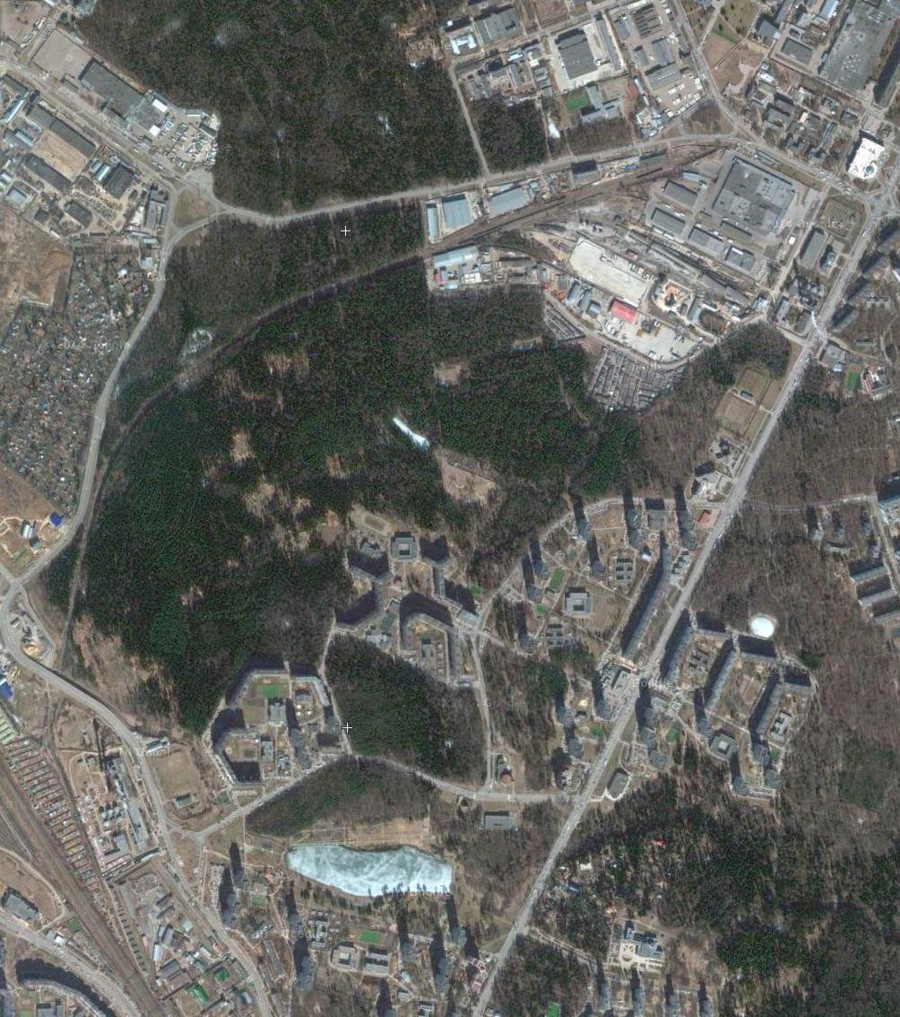 Железнодорожная линия на спутниковом снимке (источник — «Google Maps», ориентировочная дата съёмки — 2013 год).
