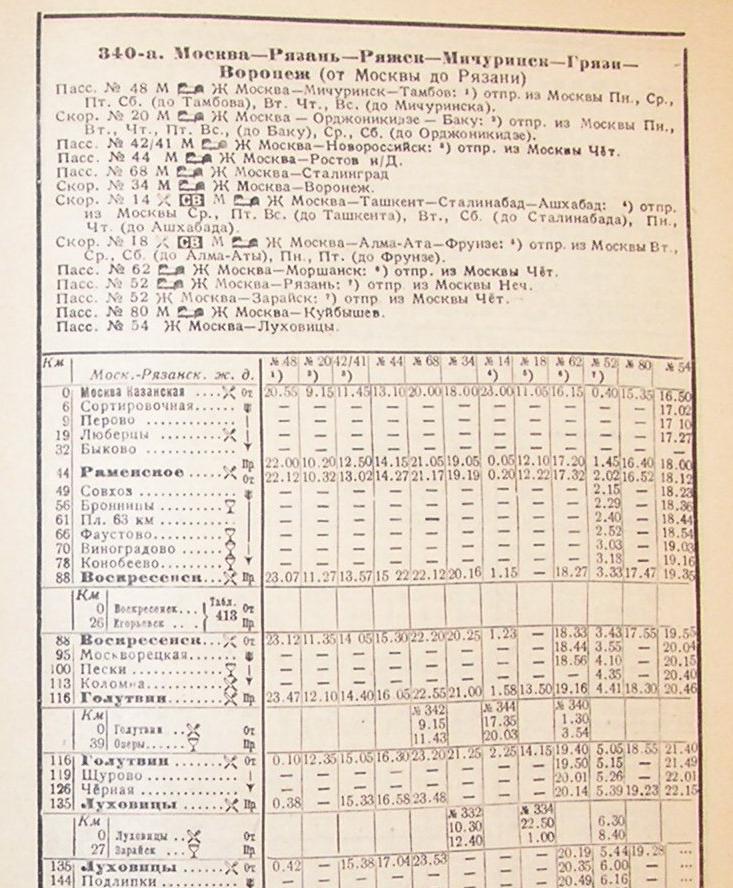 Расписание движения поездов на лето 1948 года (из «Официального указателя пассажирских сообщений»).