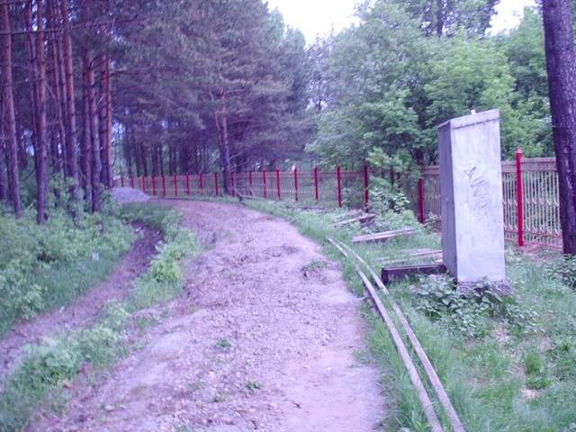 Впереди — тупик узкоколейной железной дороги. Вид в западном направлении.