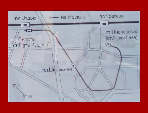 Линия узкоколейной железной дороги на плане посёлка Кратово, вывешенном вблизи остановочного пункта Кратово.