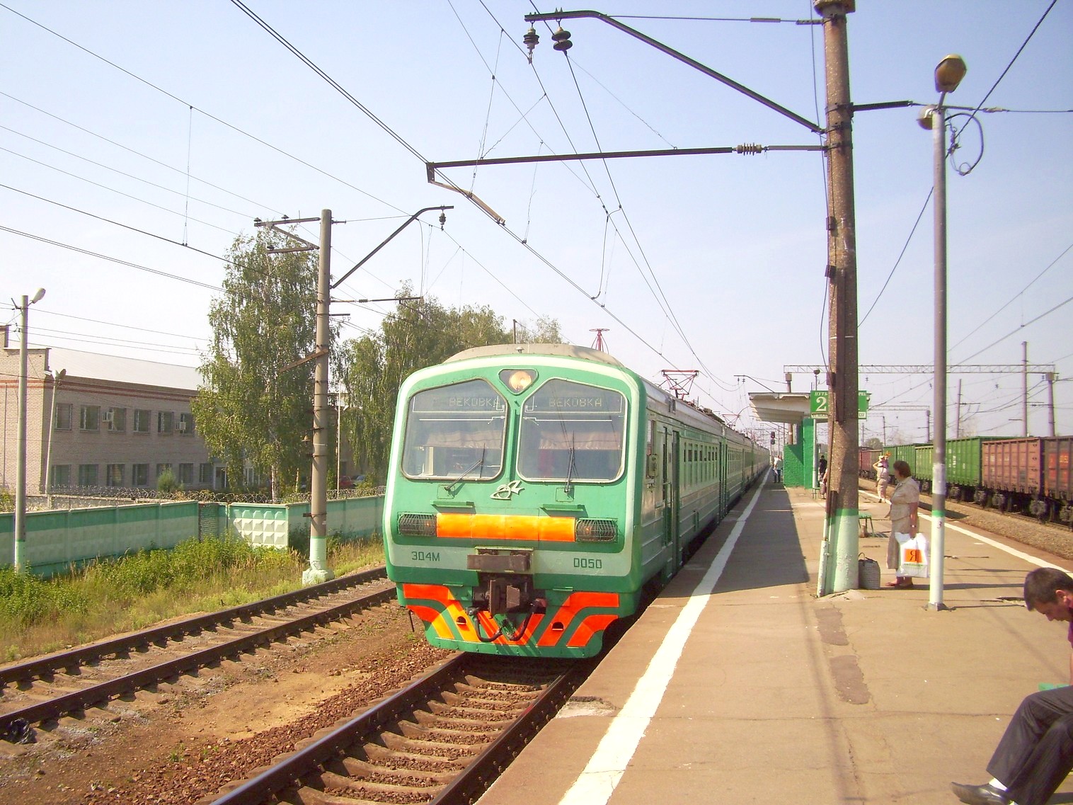 Прибывает электропоезд ЭД4М-0050, следующий по маршруту Москва — Вековка. Вид на запад.