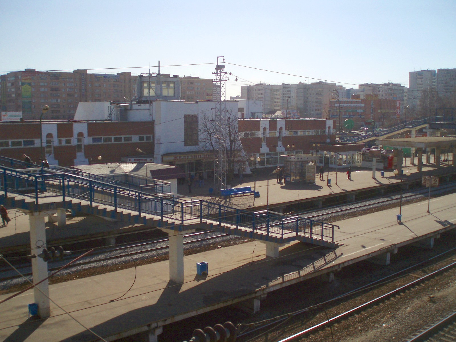 Станция Железнодорожная. Вид с «восточного» (внутреннего) переходного моста на вокзал.