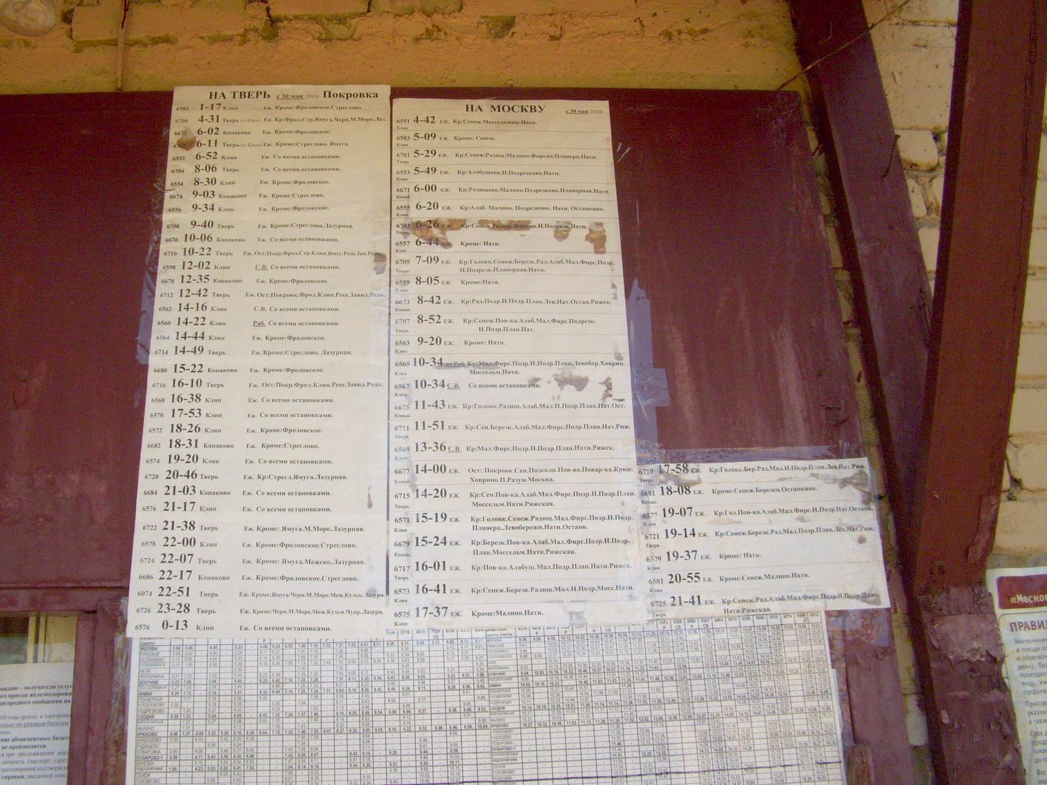 Расписание движения электропоездов, вывешенное вблизи билетной кассы.