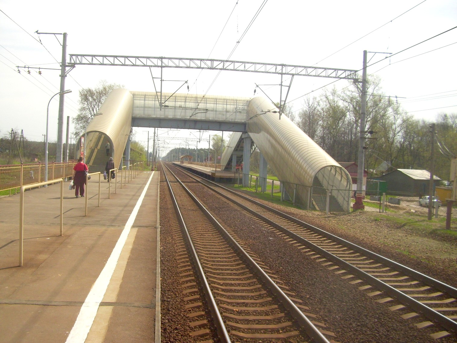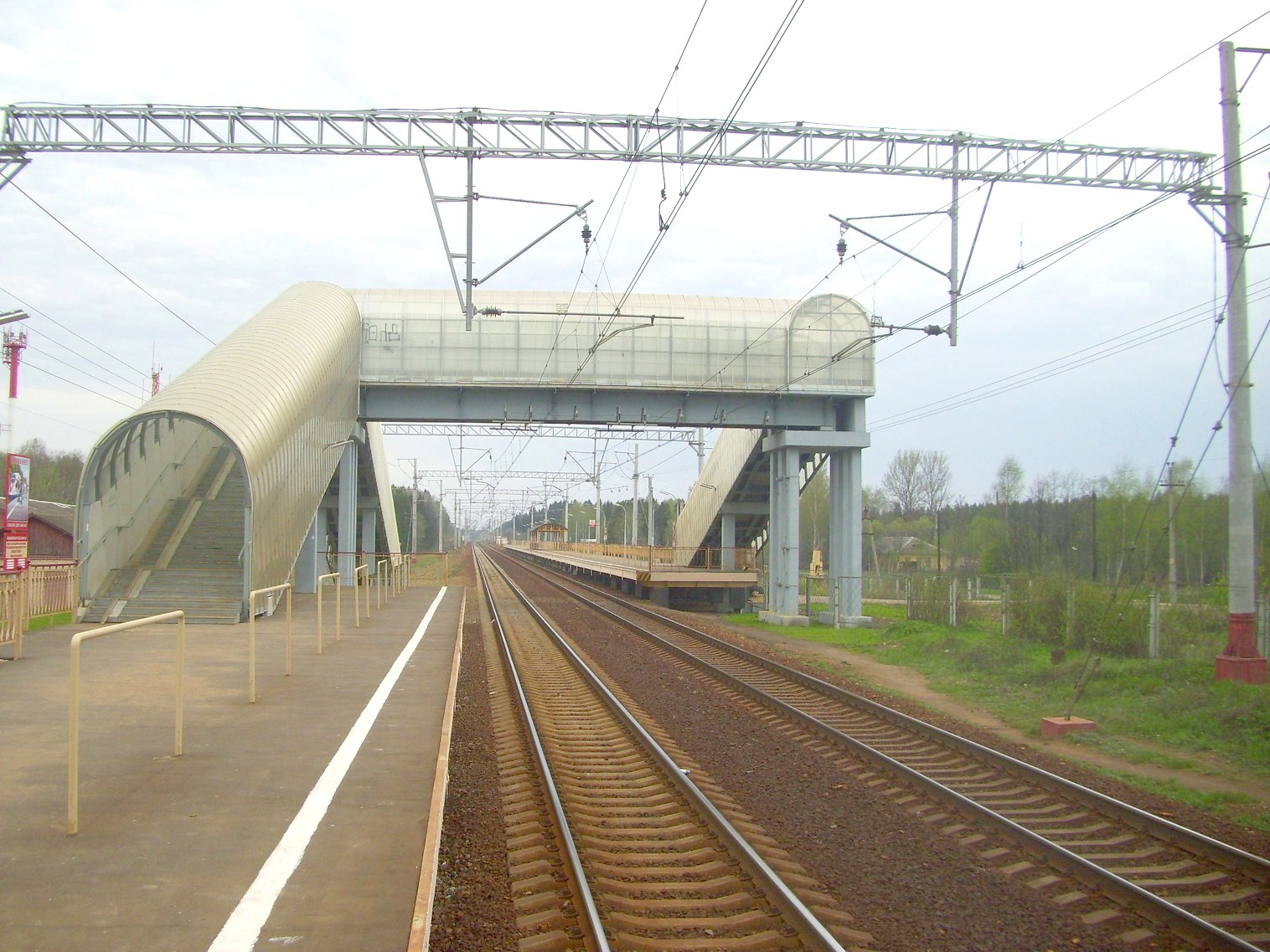 Платформа №2 (направление движения Москва — Тверь). Вид в южном направлении. Крытый пешеходный мост.