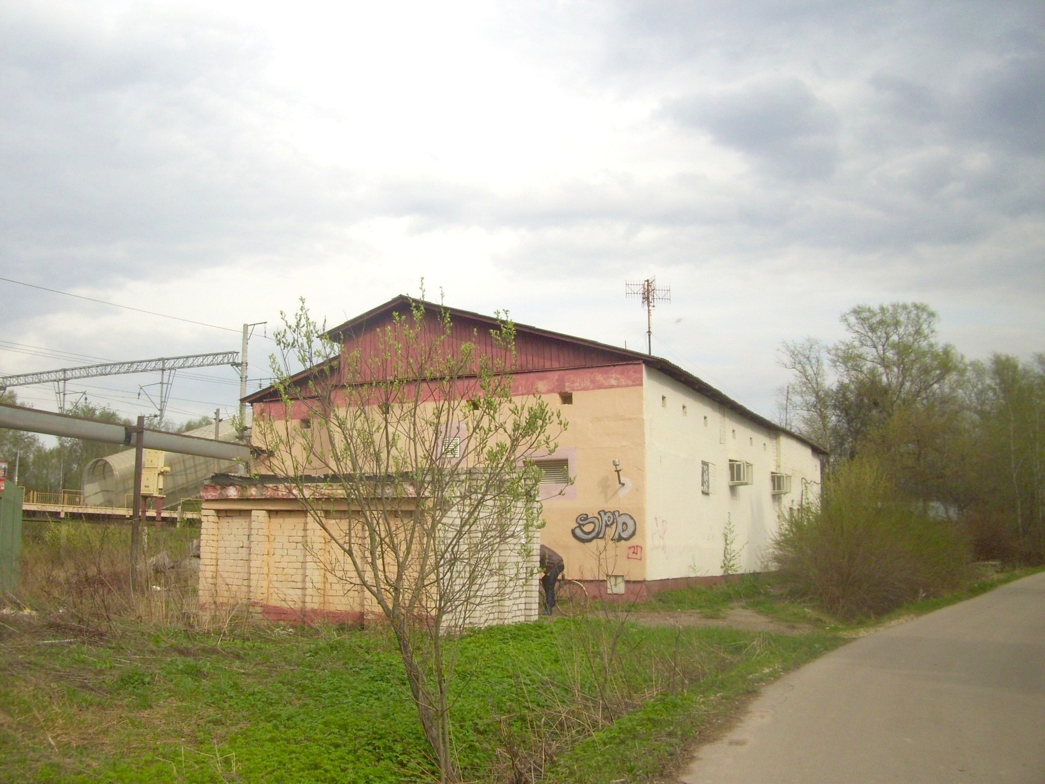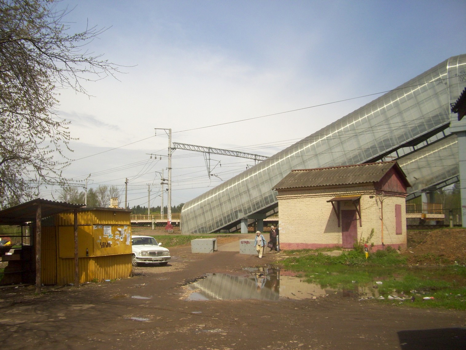 Впереди — билетная касса и пешеходный мост. Вид из посёлка.
