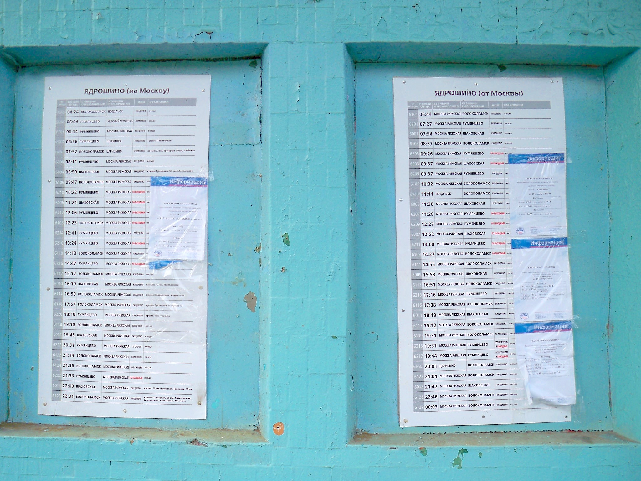 Расписание движения поездов. Вывешено на строении, расположенном на платформе №2.
