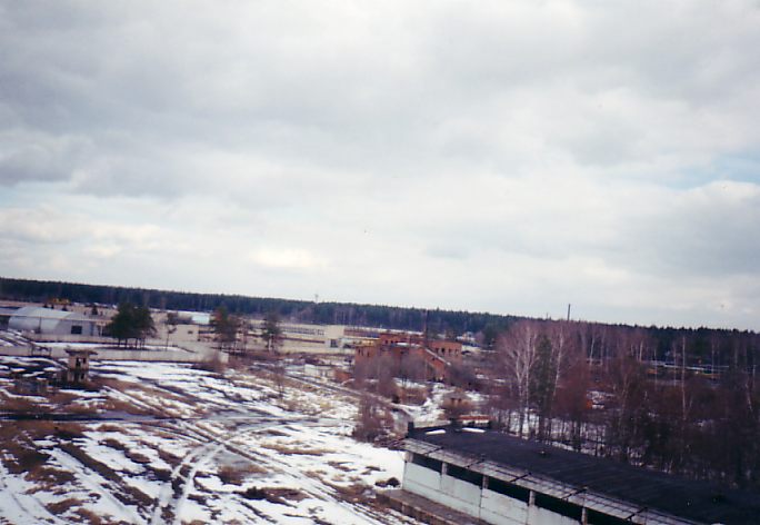 Решетниково. Станция Торфяная. Вид с вышки, стоящей у «вокзала». Кирпичное здание в глубине —