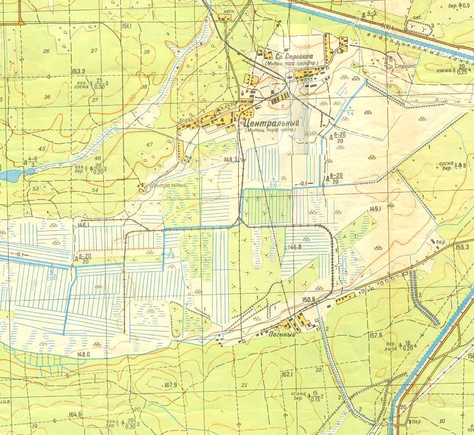 Топографическая карта масштаба 1:100 000 (состояние местности на 1980-е годы). Узкоколейная железная дорога нанесена условно.