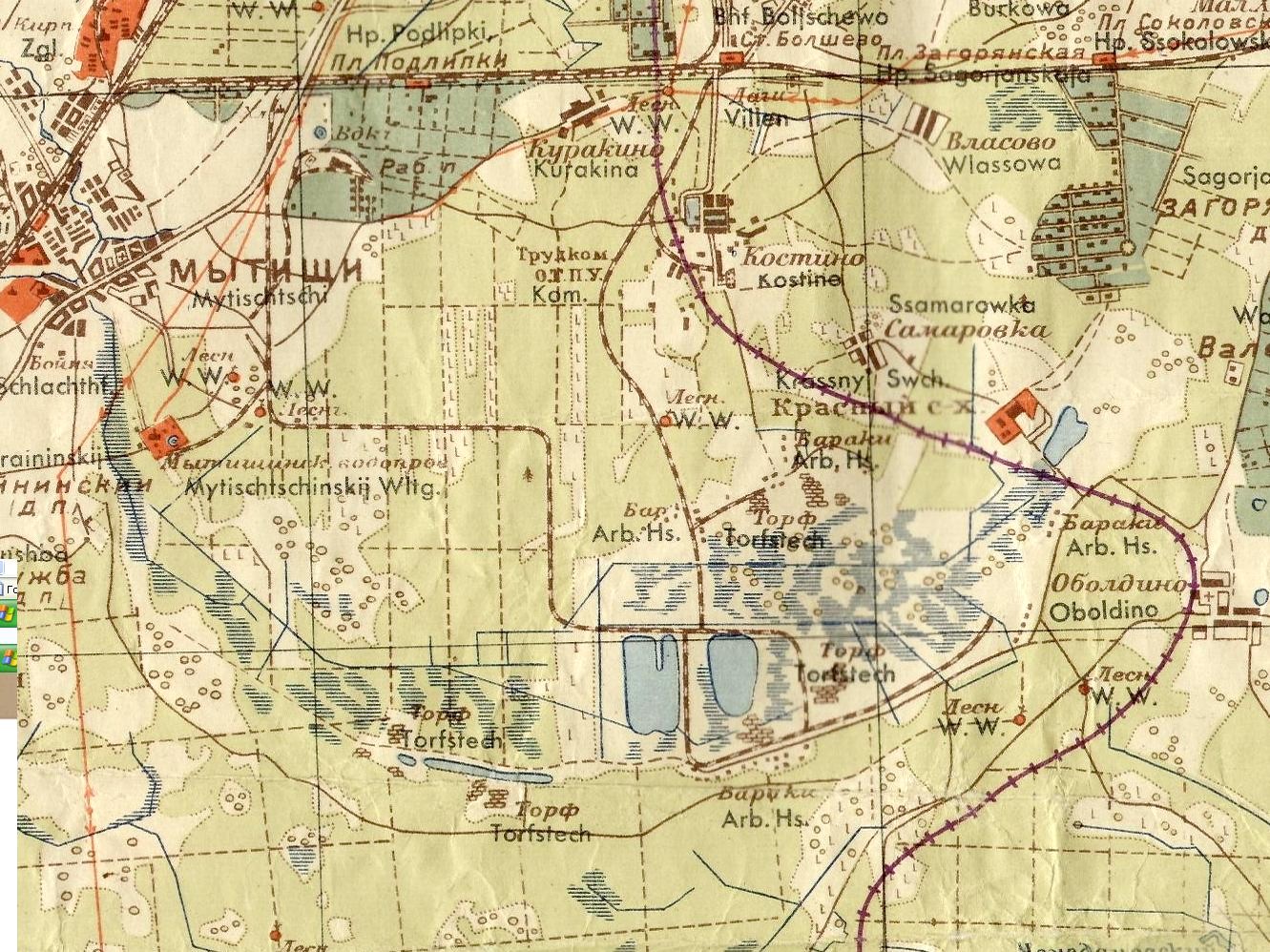 Железнодорожная линия широкой колеи (?) от станции Мытищи в район торфоразработок