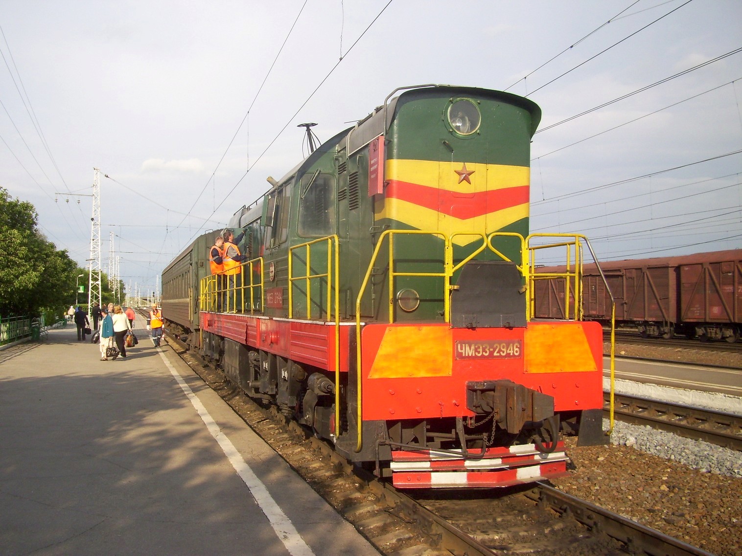 Пригородный поезд из Касимова (ЧМЭ3-2946 с одним вагоном) на станции Шилово.