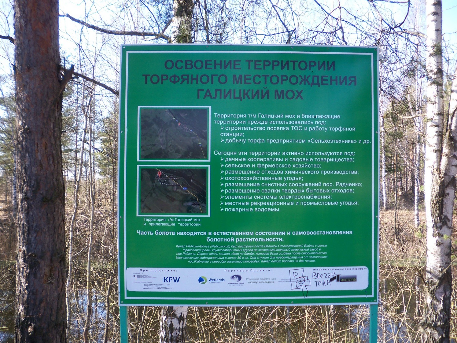 Плакат у разобранной узкоколейной железной дороги между Редкино и Радченко, рассказывающий об истории этих мест.