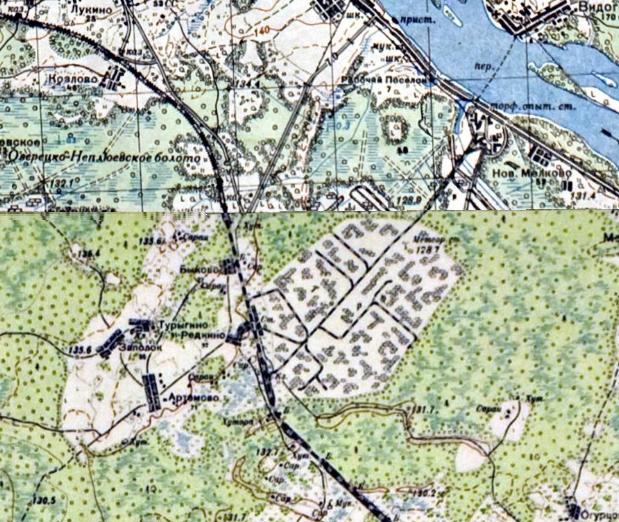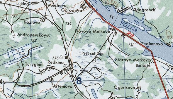 Отслеживаемая по явно заметной насыпи разобранная узкоколейная железная дорога «упирается» в автодорогу Москва — Санкт-Петербург. Когда-то она пересекала её, судя по всему. Возможно, был торфосклад на берегу Волги.