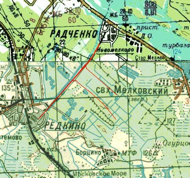 От Редкино до Радченко по короткому пути 7 километров. На автомобиле и мотоцикле так не проехать. Есть место, где требуется переброска через канаву, что можно сделать только пешком.
