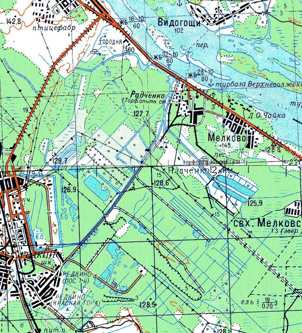 Главная линия узкоколейной железной дороги пролегала по направлению Редкино — Радченко. Рядом с ней находился канал Волга — Редкино. Он был построен во второй половине 1940-х годов и ориентировочно до 1960-х годов был судоходным. Канал предназначался для доступа судов к промышленным предприятиям посёлка Редкино.