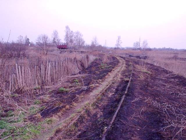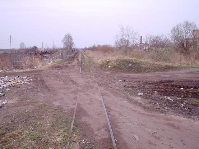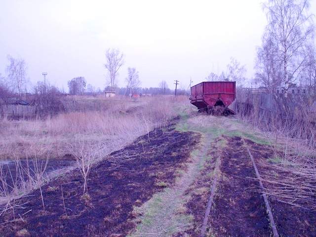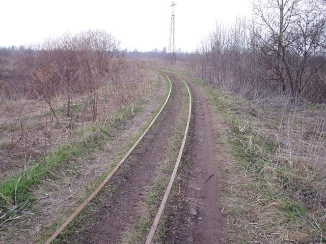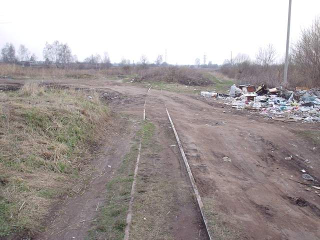 Немногим далее. Впереди - брошенный вагон ТСВ, за ним - примыкание