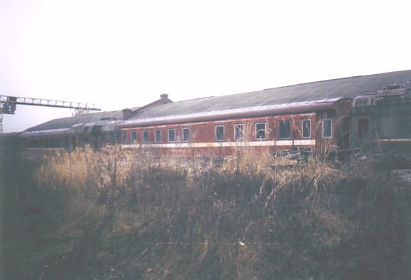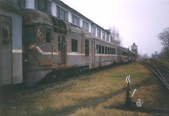 Разгромленные дизель-поезда Д1 у здания депо. Вид в направлении вокзала.