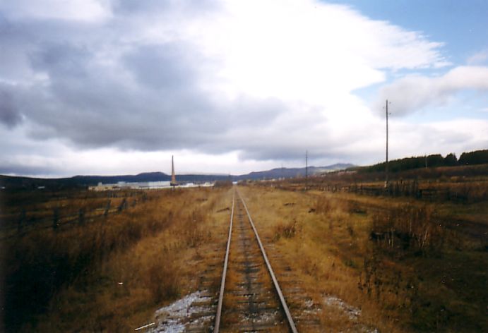 Линия узкоколейной железной дороги приближается к мосту через реку Тирлян. Вид в северном направлении.