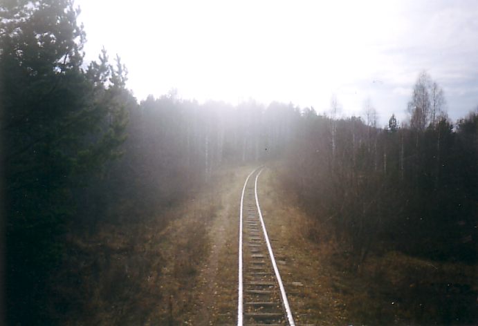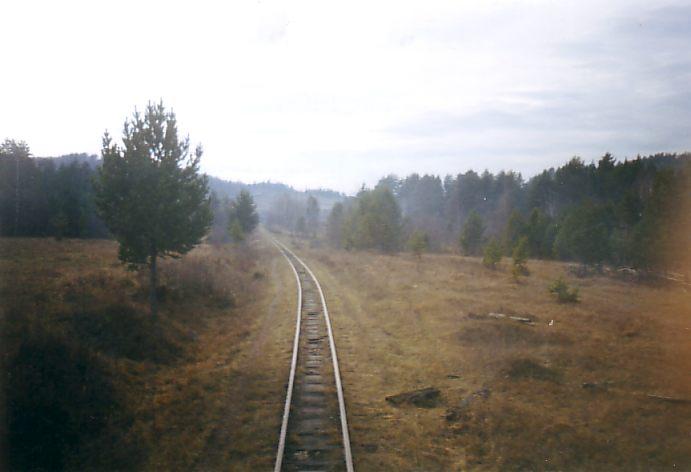Белорецкая узкоколейная железная дорога на окраине посёлка Улу-Елга. Вид в западном направлении.