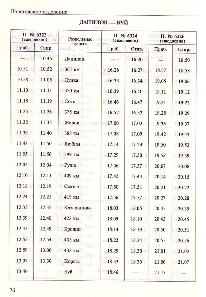 Расписание движения пригородных поездов сообщением Данилов — Буй с 1 июня 1997 года