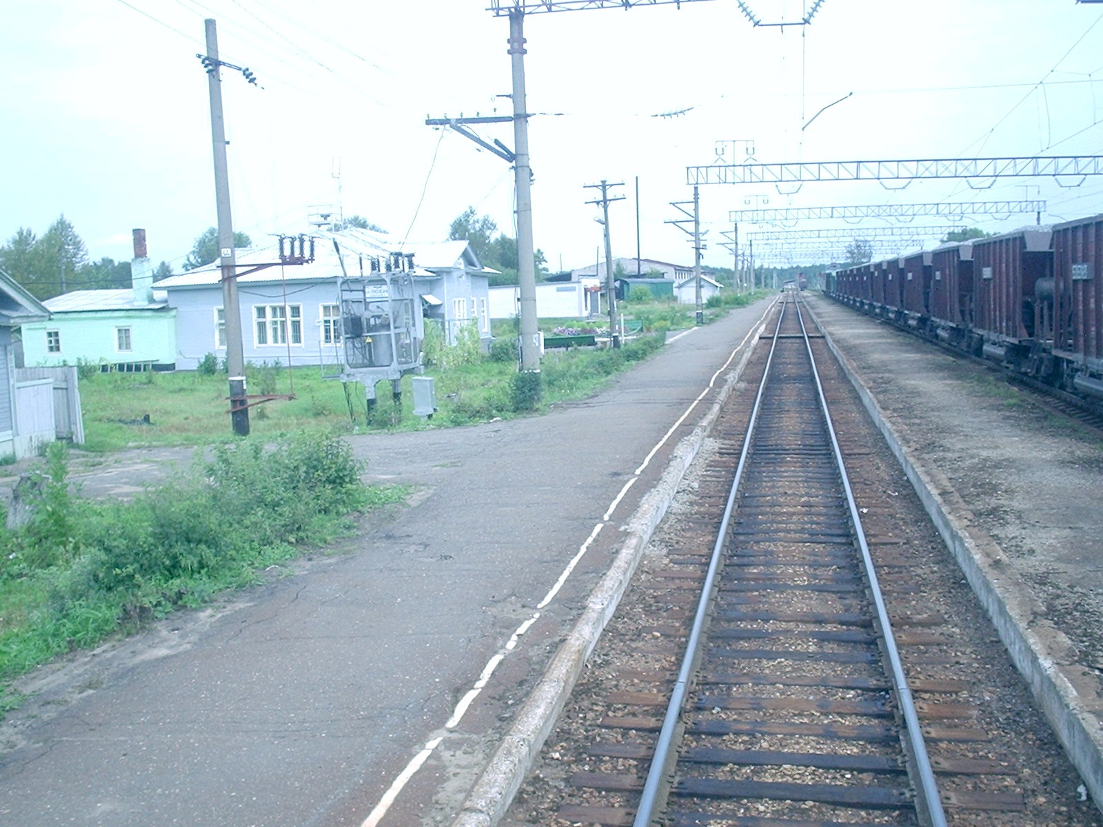 Первый путь станции Любим. Вид в восточном направлении. Слева — вокзал.
