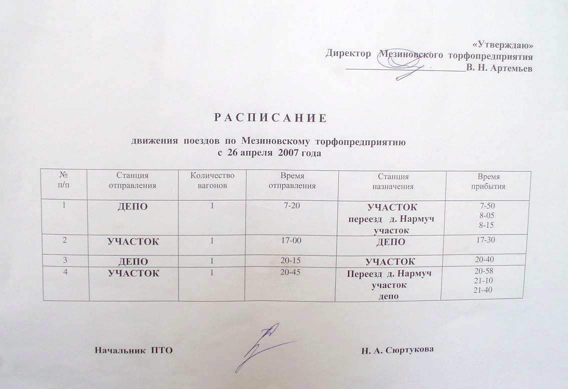 Расписание движения рабочих поездов Мезиновского торфопредприятия с 26 апреля 2007 года.