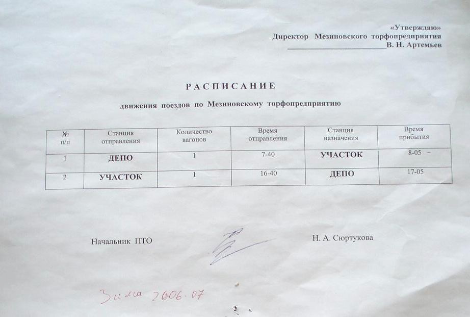 Расписание движения рабочих поездов Мезиновского торфопредприятия на зимний период 2006-2007 гг.