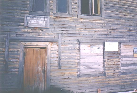 Табличка на заброшенном здании Центрального лесопункта (одновременно оно являлось