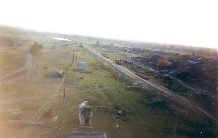 Вид с вышки на станцию узкоколейной железной дороги и посёлок Фабричное.
