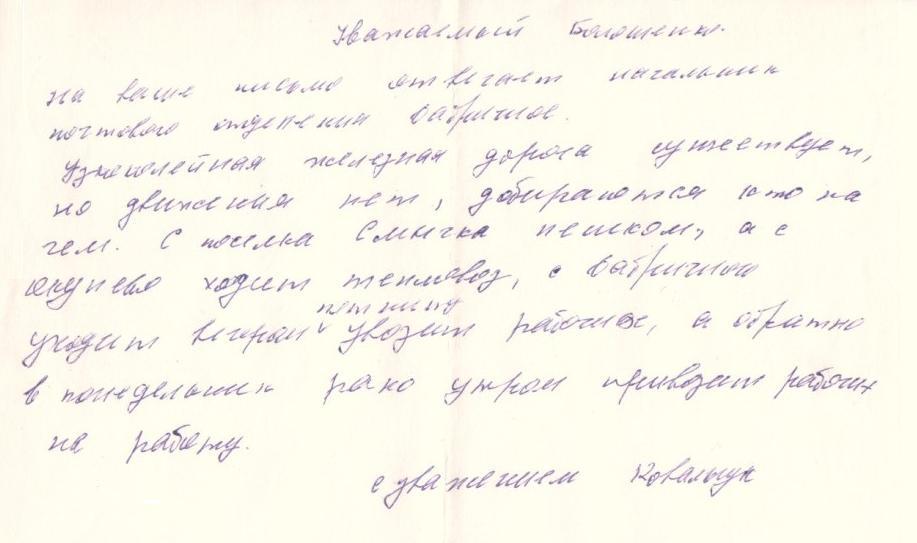 Ответ начальника отделения связи посёлка Фабричное на письмо-запрос, в котором содержалась просьба прояснить