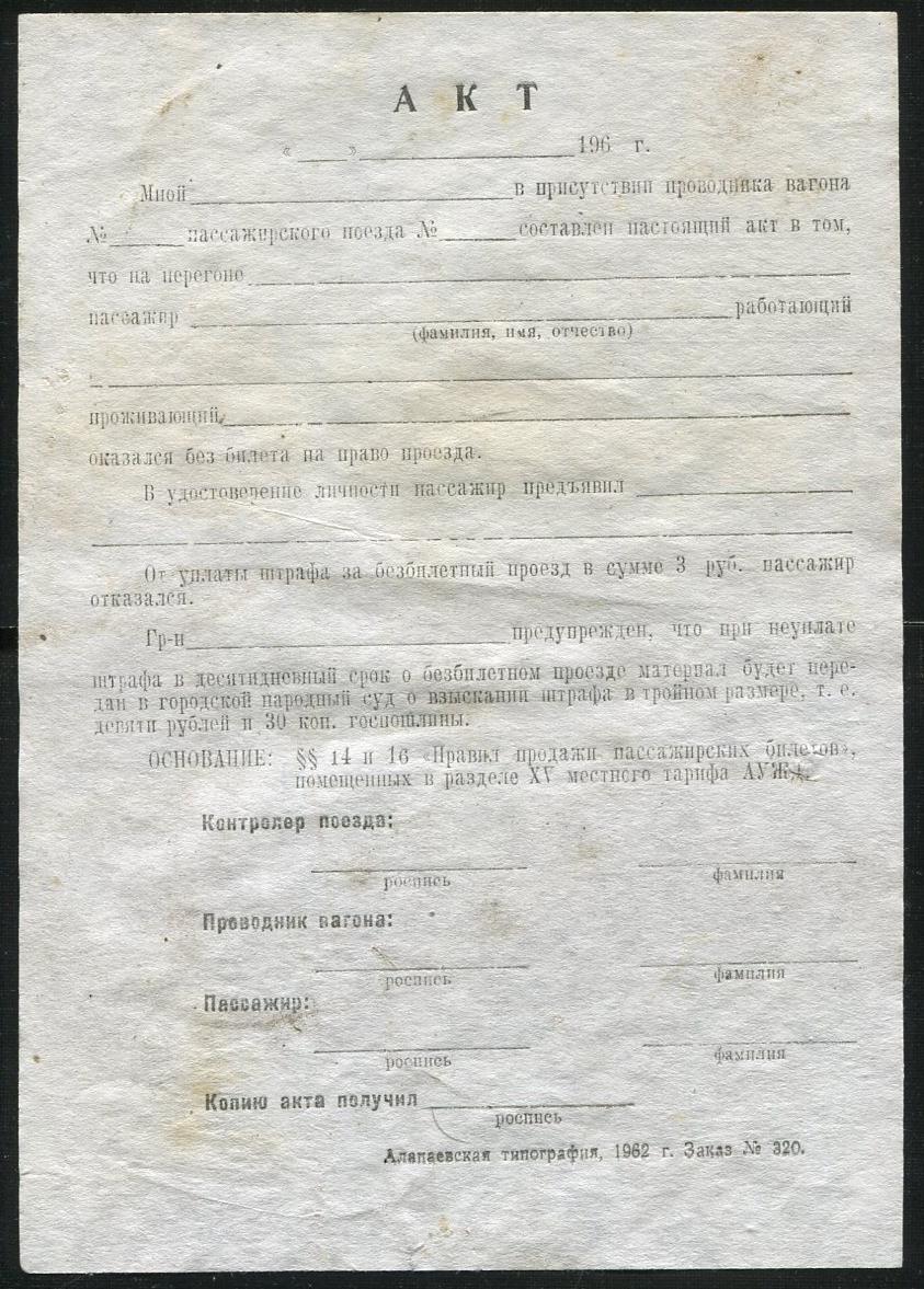 Акт оформления безбилетного пассажира (не заполнен), 1960-е годы. Найден в октябре 2014 года