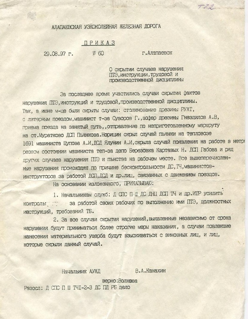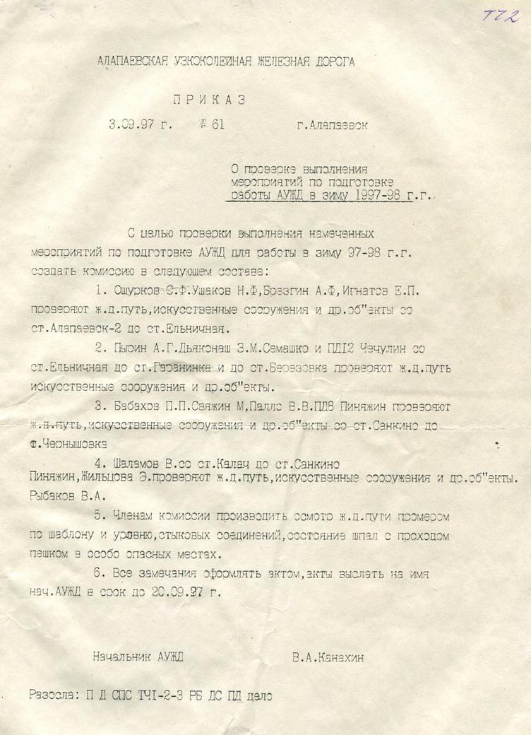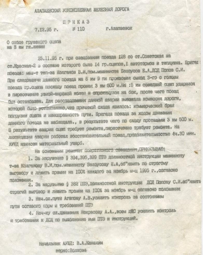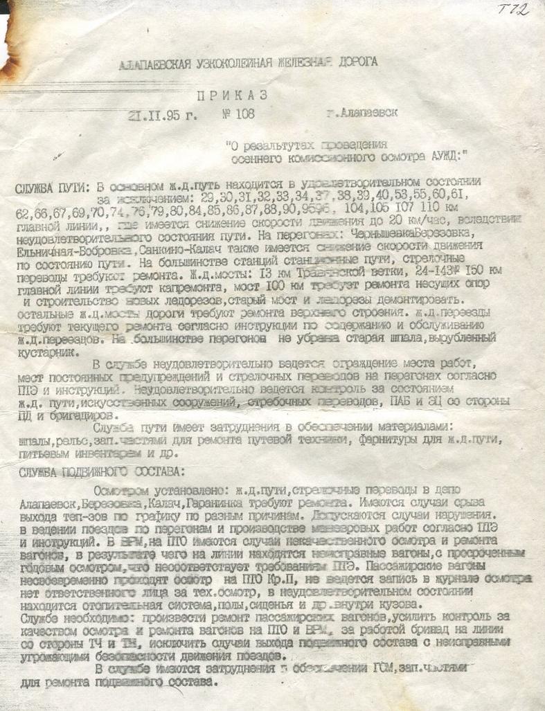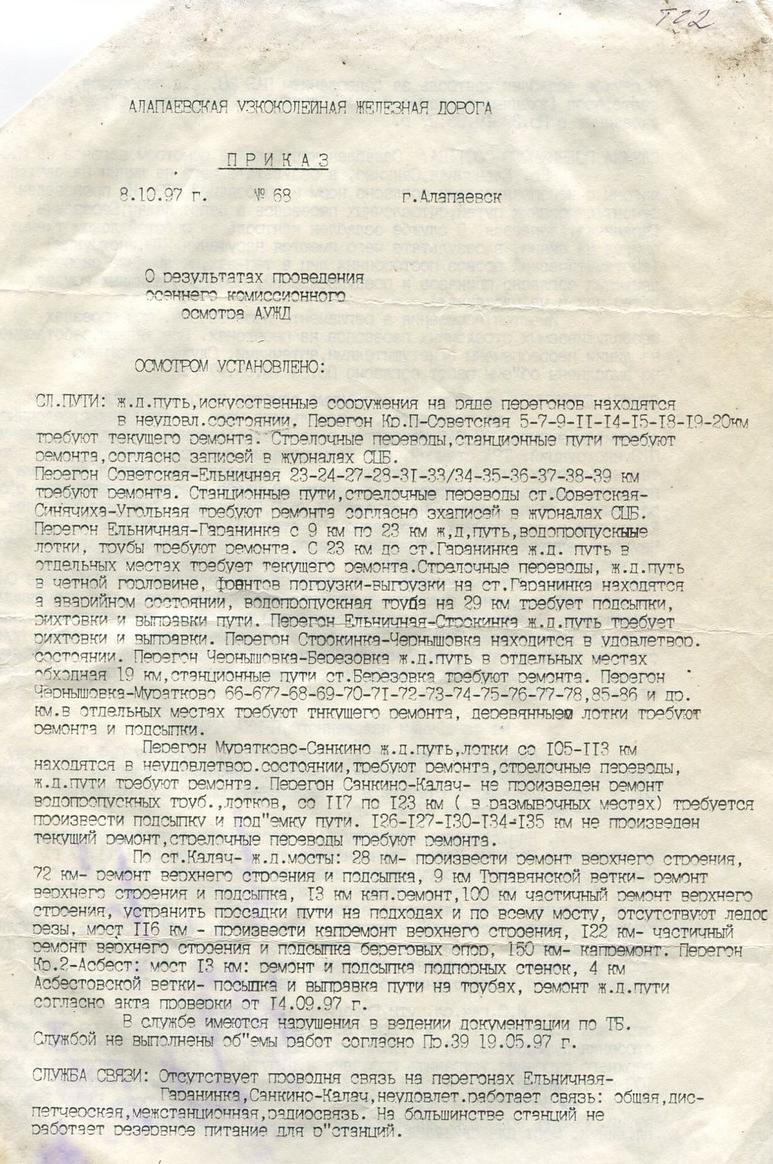 АЛАПАЕВСКАЯ УЗКОКОЛЕЙНАЯ ЖЕЛЕЗНАЯ ДОРОГА ДОКУМЕНТЫ, ПРИКАЗЫ РАЗНЫЕ