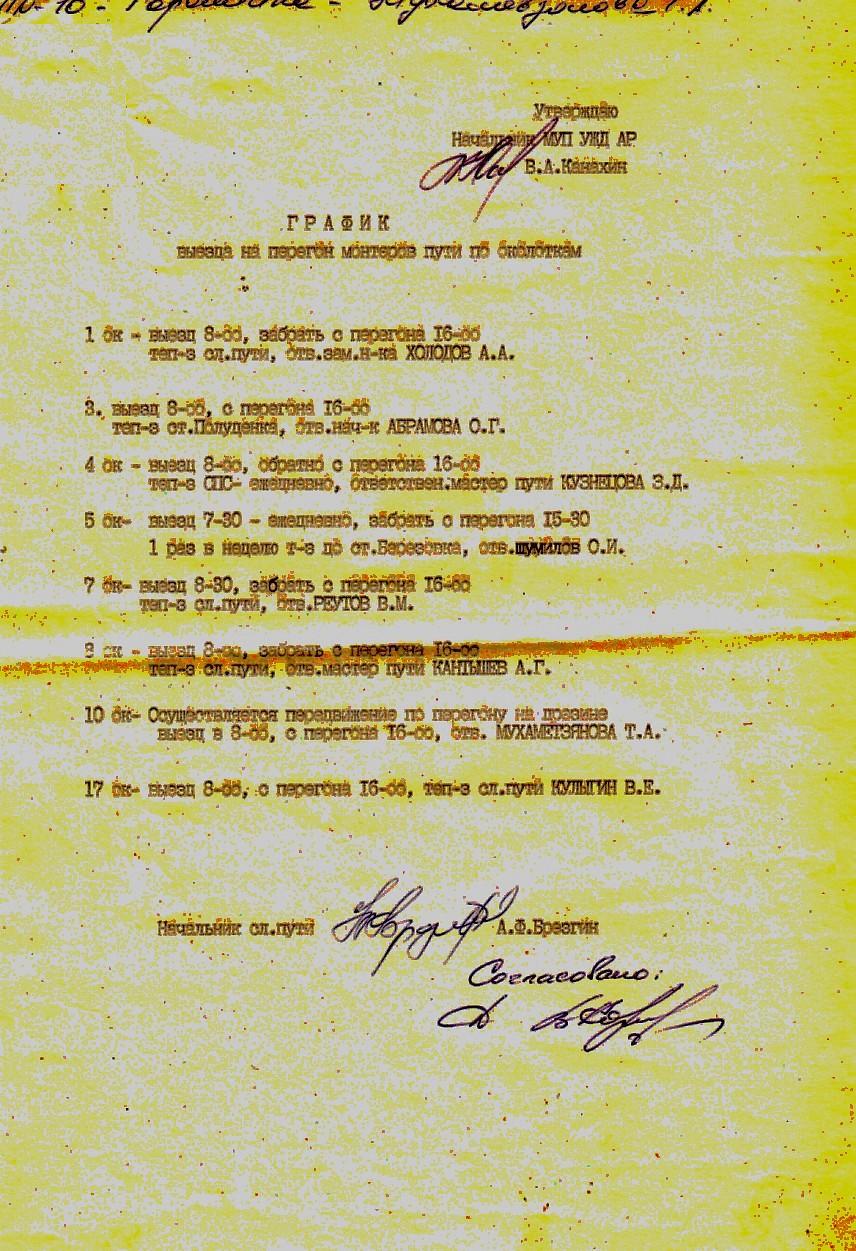 «График выезда на перегон монтёров пути по околоткам». 2002 год.