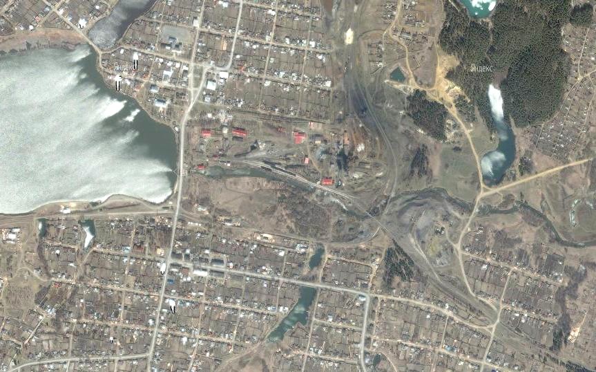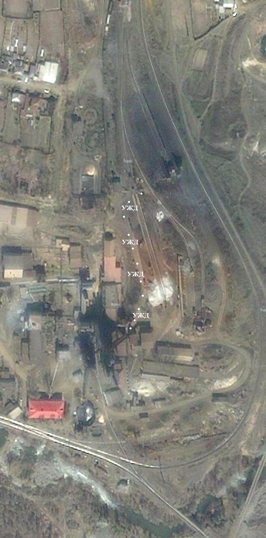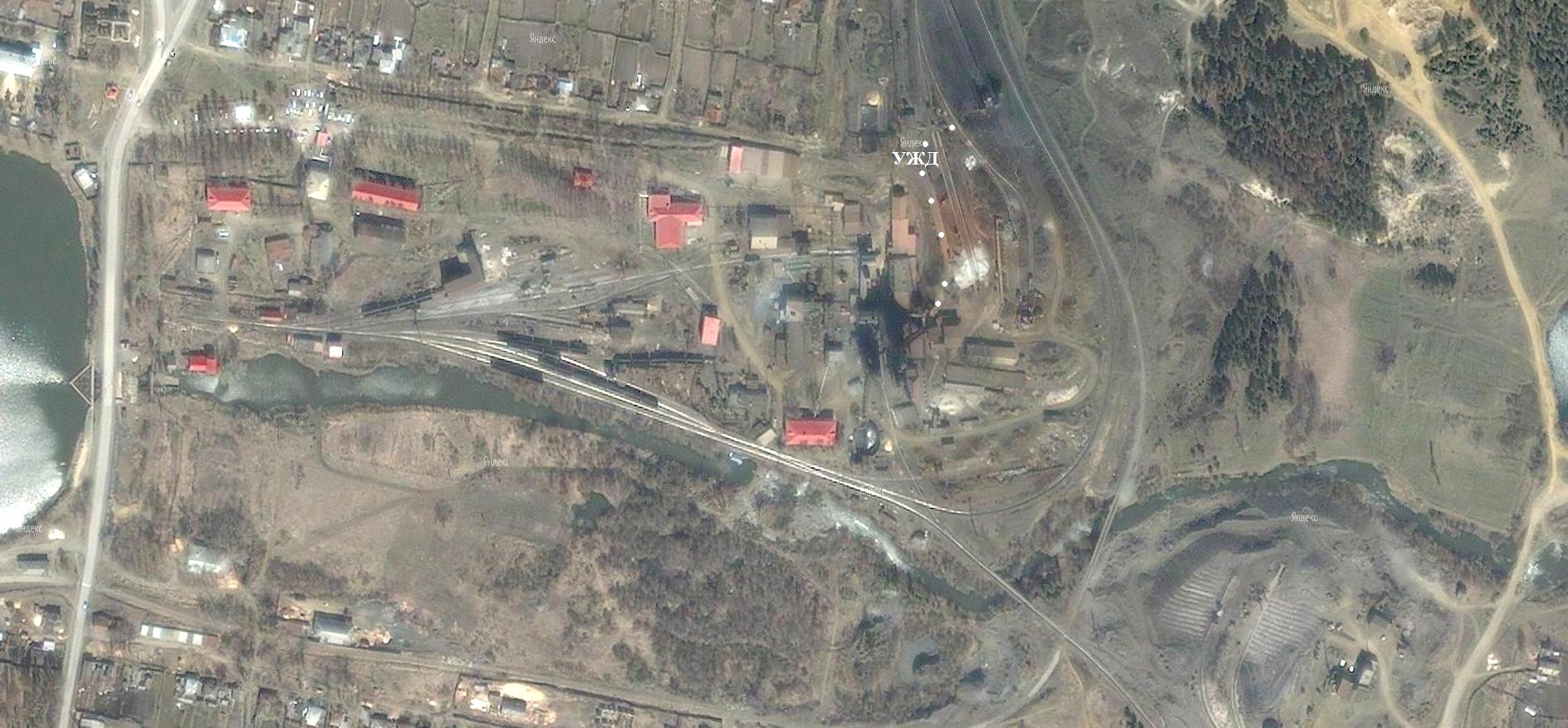 Узкоколейная железная дорога на спутниковых снимках (источник — «Maps.yandex.ru», ориентировочная дата съёмки — 2007 год).