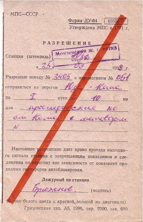 Разрешение на проследование перегона Юза - Кема (1998 год).
